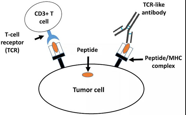 ?圖1. 理想癌癥抗原的優(yōu)先排序 ? ? ? ?細(xì)胞內(nèi)的腫瘤特異性抗原可以通過主要組織相容性復(fù)合體(MHC)I類信號通路,以腫瘤特異性肽/MHC復(fù)合物的形式存在于腫瘤表面上。TCR樣抗體識別腫瘤細(xì)胞表面的肽/MHC復(fù)合物的方式與我們熟知的TCR-T原理相同(圖2)。