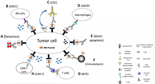 圖2. T細(xì)胞受體(TCR)和TCR樣抗體示意圖 ? ? ? ?TCR樣抗體的作用主要集中在檢測腫瘤細(xì)胞表面腫瘤特異性多肽/MHC復(fù)合物的表達(dá)和介導(dǎo)對腫瘤細(xì)胞的殺傷作用兩個(gè)方面。其詳細(xì)分子機(jī)制概述如下(圖3): ? ? ? ?1. TCR樣抗體可以與熒光試劑偶聯(lián),檢測腫瘤細(xì)胞表面多肽/MHC復(fù)合物的表達(dá)水平。例如,TCR樣抗體已經(jīng)與熒光試劑偶聯(lián),以檢測Wilms Tumor 1(WT1) RMFPNAPYL肽/人類白細(xì)胞抗原(HLA-A2)復(fù)合物在白血病細(xì)胞表面的表達(dá)水平,這提供了腫瘤特異性抗原的清晰圖譜。 ? ? ? ?2. TCR樣抗體與多肽/MHC復(fù)合物結(jié)合后可直接誘導(dǎo)腫瘤細(xì)胞死亡。這一作用是通過激活JNKs和固有的caspase通路,伴隨著腫瘤細(xì)胞中線粒體細(xì)胞色素c和凋亡誘導(dǎo)因子的釋放而介導(dǎo)的。 ? ? ? ?3. TCR樣抗體可以轉(zhuǎn)化為CAR結(jié)構(gòu),通過T細(xì)胞介導(dǎo)特異性的腫瘤溶解。由于腫瘤細(xì)胞表面缺乏腫瘤特異性生物標(biāo)志物,傳統(tǒng)的CAR-T治療實(shí)體瘤收效甚微。預(yù)見TCR樣抗體的CAR-T細(xì)胞治療可能對實(shí)體瘤有特殊的價(jià)值,因?yàn)樗槍Φ氖羌?xì)胞內(nèi)的腫瘤特異性抗原。 ? ? ? ?4. TCR樣抗體可通過ADCC、CDC或ADCP作為針對腫瘤細(xì)胞的標(biāo)準(zhǔn)抗體療法。 ? ? ? ?5. TCR類抗體還可以與細(xì)胞毒性有機(jī)化合物 (如 ADC、放射性核素和蛋白質(zhì)毒素) 偶聯(lián),以介導(dǎo)對腫瘤細(xì)胞的特異性殺傷。