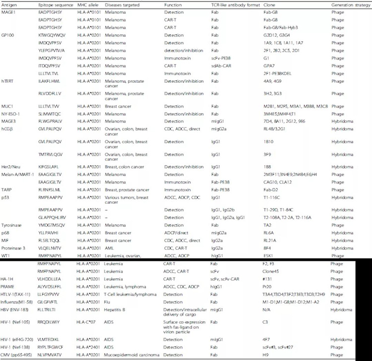 圖4. 目前在研的TCR樣抗體 ? ? ? ?然而,要獲得TCR樣抗體的臨床成功,還必須克服幾個(gè)障礙。首先,TCR樣抗體是MHC限制性的,這意味著它們只對在特定MHC等位基因上表達(dá)腫瘤特異性抗原的特定患者有效。由于HLA-A2是癌癥患者最常見的MHC等位基因,已發(fā)現(xiàn)許多與該等位基因相關(guān)的腫瘤特異性多肽。然而,其他HLA等位基因仍然缺乏腫瘤特異性多肽,這阻礙了TCR樣抗體治療的發(fā)展。進(jìn)一步鑒定不太常見的MHC相關(guān)肽將有助于解決這個(gè)問題。第二,腫瘤細(xì)胞表面肽/MHC復(fù)合物的下調(diào)或缺失是腫瘤細(xì)胞逃避免疫監(jiān)視的常見機(jī)制。然而,一些報(bào)告顯示一些化學(xué)物質(zhì)、細(xì)胞因子或放射治療可以上調(diào)MHC的表達(dá)并激活MHC信號通路。因此,TCR樣抗體可以與其他療法聯(lián)合使用以達(dá)到最佳效果。第三,免疫抑制環(huán)境是TCR樣抗體免疫治療的障礙。腫瘤細(xì)胞駐留在隱蔽的位置,以阻止T細(xì)胞的進(jìn)入,并產(chǎn)生低氧環(huán)境以及分泌大量免疫抑制細(xì)胞因子,如IL-10、TGF-β。此外,腫瘤細(xì)胞周圍有許多抑制性免疫細(xì)胞,這都會(huì)削弱抗腫瘤免疫反應(yīng)。因此,TCR樣抗體可能與腫瘤細(xì)胞表面的肽/MHC復(fù)合物結(jié)合,但可能不介導(dǎo)腫瘤的破壞。將TCR樣抗體治療與其他免疫抑制療法相結(jié)合,或許可以幫助解決這一問題。