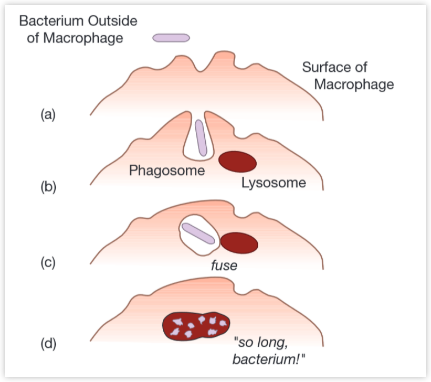 ? ? ? ?我們可以觀察到巨噬細胞并不是等著細菌送上門來從而吞噬,而是它感受到了細菌的存在,于是伸出了“觸手”主動地去抓細菌。那么巨噬細胞是怎么知道細菌在那兒的呢?這是因為在巨噬細胞的表面有很多“觸角”(即受體),而這些“觸角”可以識別出常見的微生物“侵略者”身上所帶有的“危險分子”的特征。舉個例子,細菌的細胞膜是由一些脂質(zhì)和糖所組成的,而這其中的一些成分是在人體內(nèi)不存在的。這樣的一些外來分子就像是在給巨噬細胞說:“來啊來吃我啊!”一旦巨噬細胞識別了這些“危險分子”,他們就開始向著發(fā)出這種信號的微生物 “匍匐前進”。 ? ? ? ?當(dāng)巨噬細胞遇到細菌時,它會先將細菌吞進一個叫作吞噬體(phagosome)的小袋子(囊泡)里,然后這個含有細菌的囊泡會被運送到吞噬細胞內(nèi)部,與另一個叫作溶酶體(lysosome)的囊泡融合。溶酶體中含有各種強力的化學(xué)物質(zhì)和酶,這些物質(zhì)可以有效地殺死細菌。事實上這些物質(zhì)的殺傷力是毀滅性的,如果它們在巨噬細胞內(nèi)部被釋放,那么巨噬細胞自己也難以逃脫被殺死的命運,這也是為什么要將它們裝在囊泡里的原因。運用這樣一個充滿智慧的策略,巨噬細胞可以高效地殲滅“入侵者”,而不會搬起石頭砸自己的腳。這整個過程叫作吞噬作用(phagocytosis),下圖展示了其發(fā)生的整個過程。 圖片4:吞噬作用