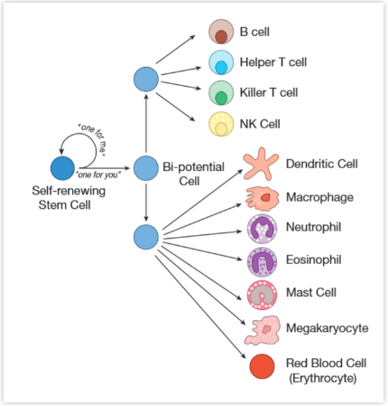 ? ? ? ?那么巨噬細胞是從哪來的呢?巨噬細胞和身體里的其他血細胞一樣,都是起源于在骨髓中的一種具有自我更新能力的細胞—干細胞(Stem cell),干細胞可以形成所有的血細胞。干細胞自我更新時,即當(dāng)一個干細胞生長并分裂成為兩個子細胞時,遵循“一個給我,一個給你”的原則,也就是說分裂形成的兩個子細胞中一個變回干細胞,保留自我更新的能力,而另一個最終會變成成熟的血細胞。這種不斷的自我更新的策略確保了總是會有儲存的干細胞,可以不斷地產(chǎn)生成熟的血細胞。 圖片6:干細胞分化示意圖