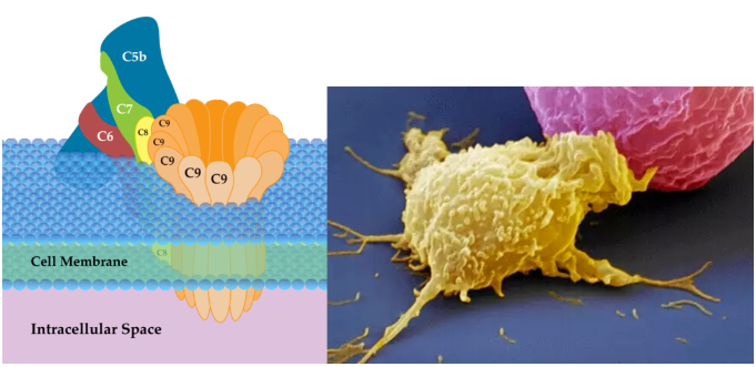 除了像巨噬細胞這樣專門負(fù)責(zé)吞噬“入侵者”的專職吞噬細胞外,固有免疫系統(tǒng)的隊伍之中還有其他的角色,比如可以在細菌表面打洞的補體蛋白(Complement),以及可以摧毀細菌、寄生蟲、病毒侵染細胞和一些癌細胞的自然殺傷細胞(Natural Killer cell)。諸如此類的巨噬細胞的其他隊友我們會在后面的幾期詳細介紹。 圖片9:補體和NK細胞