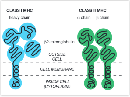 ▉? 抗原提呈 ? ? ? ?目前已經證實有一種被稱作主要組織相容性復合體(major histocompatibility complex,MHC)的蛋白在抗原提呈過程中起“提呈”的作用,而T細胞則是用其受體分析確認被提呈的抗原。”histo”意味著組織,這些主要組織相容性蛋白除了作為提呈分子外,還與器官移植中的排斥反應相關。事實上,當你聽到某個腎衰竭的患者在等待一個匹配的腎源時,就是在說移植手術的供體和受體的MHC分子應該匹配。 ? ? ? ?MHC分子有兩類,即MHCⅠ類分子和MHCⅡ類分子。MHCⅠ類分子在機體大多數(shù)細胞表面都有分布,但是數(shù)量上卻有很大的差別。MHCⅠ類分子就像是一塊廣告牌,告知殺傷性T細胞這些細胞內部的情況。例如,當一個人體細胞被病毒感染后,病毒蛋白的片段——多肽就會裝載到MHCⅠ類分子上,并被運輸?shù)讲《靖腥炯毎砻?。通過檢查這些被MHCⅠ類分子展示的蛋白片段,殺傷性T細胞可以用其受體窺探到這些細胞內部的情況,發(fā)現(xiàn)該細胞已經被病毒感染并且應該被消滅。 ? ? ? ?MHCⅡ類分子也發(fā)揮一種“告示牌”的作用,但這種展示主要針對輔助性T細胞的激活。在機體中,只有一些特定類型的細胞才能產生MHCⅡ類分子,這些細胞被稱作抗原提呈細胞(antigen presenting cell,APC),比如巨噬細胞就是一種優(yōu)秀的抗原提呈細胞。在細菌感染過程中,巨噬細胞會吞噬細菌,并將消化了的細菌蛋白片段裝載到MHCⅡ類分子上,以復合物形式展示在巨噬細胞表面。通過T細胞受體的識別,輔助性T細胞可掃描到巨噬細胞MHCⅡ類分子上的細菌感染信息。綜上所述,MHCⅠ類分子可在細胞內出現(xiàn)異常時向殺傷性T細胞發(fā)出警告,而MHCⅡ類分子則展示在抗原提呈細胞表面,將細胞外出現(xiàn)異常的消息告知輔助性T細胞。 圖片3:廣告牌 ? ? ? ?盡管MHCⅠ類分子是由一條長鏈(重鏈)和一條短鏈(β2-微球蛋白)所組成,而MHCⅡ類分子由兩條長鏈(α和β)組成,但是我們可以看到這兩類分子還是十分相似的。 圖片4:MHC分子 ? ? ? ?從上面的平面圖很難顯示出這些分子的真實形狀,因此下面我們將展示一些更形象的圖片來幫助大家理解。下圖是T細胞受體視角下一個空的MHC分子的樣子,我們可以看到中間有一個凹槽,可以容納蛋白質片段。 圖片5:空的MHC分子 ? ? ? ?而下圖是填滿了蛋白質片段的MHCⅠ類分子。說它是MHCⅠ類分子是因為肽段剛好填滿了凹槽。目前已經證實MHCⅠ類分子形成的凹槽兩端是封閉的,因此蛋白質片段必須剛好約為9個氨基酸才能填入其中,而MHCⅡ類分子則與之不同。 圖片6:MHCⅠ類分子 ? ? ? ?而在下圖中,肽段溢出了凹槽,這是因為MHCⅡ類分子的凹槽兩端是開放的,因此蛋白質片段的長度約為20個氨基酸時較為合適。 圖片7:MHCⅡ類分子 ? ? ? ?因此MHC分子的結構類似于小面包,而蛋白質片段則類似于其中所夾的維也納小香腸。如果想象我們機體的細胞表面存在著一個個熱狗,那么我們就不會對抗原的提呈感到迷惑了。