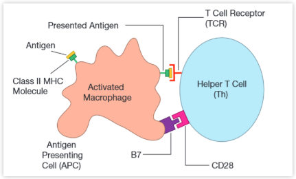 ▉? 適應性免疫系統(tǒng)的激活 ? ? ? ?由于B細胞和T細胞是如此強有力的武器,因此大自然特別規(guī)定在適應性免疫系統(tǒng)發(fā)揮功能之前必須要被激活。綜合來看,B細胞和T細胞都被稱作淋巴細胞,它們被激活的方式是免疫學中的關鍵問題之一。為了介紹這個概念,我們需要先了解輔助性T細胞激活的方式。 ? ? ? ?輔助性T細胞激活的第一步是識別被MHCⅡ類分子展示在抗原提呈細胞表面的同源抗原,但是僅識別“告示牌”上的同源抗原是不夠的,激活還需要第二個關鍵信號。第二個信號是非特異性的,即對所有抗原均相同,它涉及到抗原提呈細胞表面的一個蛋白(B7),該蛋白與輔助性T細胞表面相應受體(CD28)結合時,就形成了第二信號。 圖片8:輔助性T細胞的激活 ? ? ? ?當你使用銀行的保險箱時,你就能體會這樣兩個關鍵結構形成的系統(tǒng)的實例。你有一把特定開啟該保險箱的鑰匙,這把鑰匙只能用于開這把鎖,而不能開別的鎖。而銀行職員則提供第二把鑰匙,這把鑰匙適用于所有的保險箱。只有當兩把鑰匙同時插入保險箱中時,保險箱才能開啟,而單獨使用你特定的鑰匙或銀行職員的鑰匙都無法打開,必須同時需要兩把鑰匙。那么,你覺得為什么輔助性T細胞和適應性免疫系統(tǒng)中的其他細胞需要兩個關鍵信號才能激活呢?答案當然是為了安全,就像你的保險箱一樣。這些細胞是極其強大的武器,因此只能在適宜的時間和場所被激活。 圖片9:雙鑰匙鎖 ? ? ? ?一旦輔助性T細胞被兩個信號系統(tǒng)激活后,它就會迅速增殖,形成一個由能夠識別相同抗原的許多輔助性T細胞組成的克隆。隨后這些細胞逐漸成熟,變成可以產生細胞因子以指揮免疫系統(tǒng)反應的細胞。B細胞和殺傷性T細胞的激活也需要“雙鑰系統(tǒng)”,這一點我們將在另一期單獨講解。