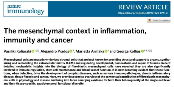 二、簡介 ? ? ? ?2020年8月3日,來自希臘亞歷山大弗萊明生物醫(yī)學(xué)科學(xué)研究中心的Vasiliki Koliaraki教授和George Kollias課題組在Nature Immunology(IF: 20.479)雜志上發(fā)表題為“The mesenchymal context in inflammation, immunity and cancer”的綜述[1]。本文中,作者簡要概述了纖維母細(xì)胞間充質(zhì)細(xì)胞在生理和疾病方面的相關(guān)作用,并重點介紹了它們在單細(xì)胞水平上的異質(zhì)性以及它們在組織特異性和時空功能多樣性方面的新證據(jù)。