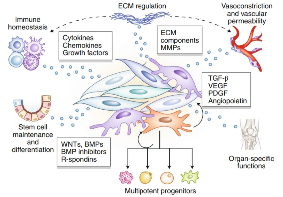 三、主要結(jié)果 ? ? ? ?1. 間充質(zhì)細(xì)胞的穩(wěn)態(tài)作用 ? ? ? ?駐留間充質(zhì)細(xì)胞,包括不同的成纖維細(xì)胞亞群、間充質(zhì)干細(xì)胞和血管周圍細(xì)胞,具有重要的穩(wěn)態(tài)功能。它們調(diào)節(jié)ECM來支持組織結(jié)構(gòu)以及完整性,它們支持正常的血管功能,如血管收縮和血管通透性,在初級和二級淋巴器官和組織中調(diào)節(jié)免疫內(nèi)穩(wěn)態(tài),形成環(huán)境維護的干細(xì)胞(造血的或上皮性)。它們具有自我更新和多潛能功能,而不同器官中不同的MCs具有器官特異性功能(例如滑液成纖維細(xì)胞具有潤滑關(guān)節(jié)的功能)。 圖1:間充質(zhì)細(xì)胞的穩(wěn)態(tài)作用