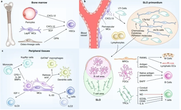 ? ? ? ?2. 免疫中的間充質(zhì)細(xì)胞 ? ? ? ?免疫反應(yīng)的激活需要特殊的龕位,即免疫-間充質(zhì)串?dāng)_發(fā)生的地方。MCs,特別是LepR+間充質(zhì)干細(xì)胞、周細(xì)胞和骨系細(xì)胞,是骨髓造血干細(xì)胞龕的重要組成部分。它們通過可溶性生態(tài)位因子CXCL12、SCF和OPN調(diào)控HSCs的成熟。在胚胎發(fā)育過程中,血管周圍的MCs通過LTi細(xì)胞來源的LTα1β2分化為淋巴組織組織者細(xì)胞,從而產(chǎn)生SLO原體。出生后,募集 B細(xì)胞和T細(xì)胞,誘導(dǎo)SLO分化和LTo分化為成熟間充質(zhì)細(xì)胞群,包括MRCs、FDCs和TRCs。SLO-MC群通過與其他基質(zhì)細(xì)胞相互作用來形成微環(huán)境,并通過細(xì)胞因子分泌和抗原遞呈來調(diào)節(jié)免疫細(xì)胞反應(yīng)。外周組織間充質(zhì)-免疫相互作用導(dǎo)致免疫細(xì)胞中組織特異性特征。 圖2:免疫中的間充質(zhì)細(xì)胞