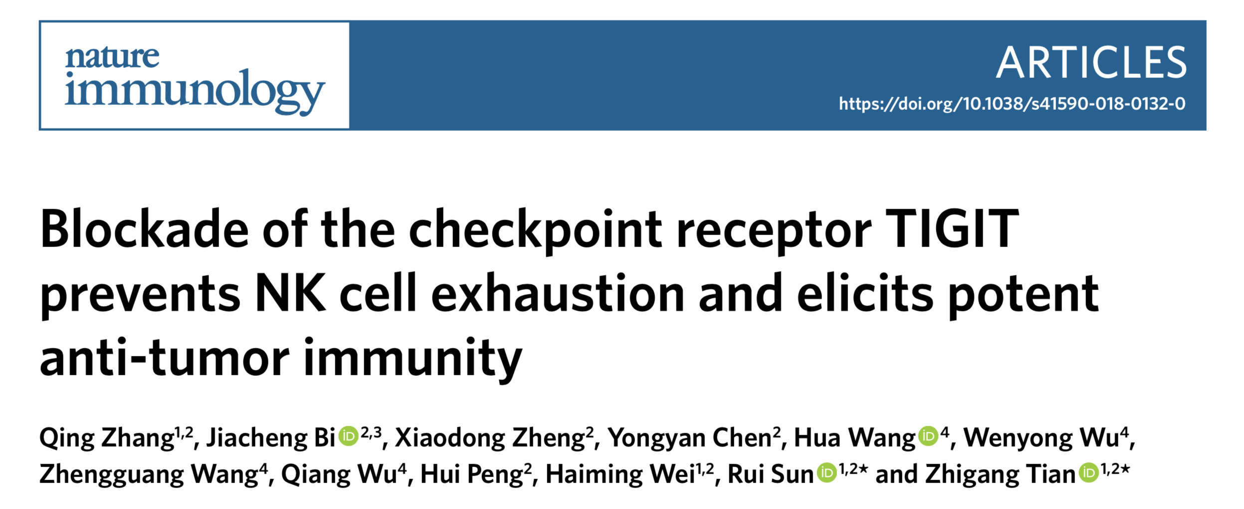 [2]. Qing Zhang, Jiacheng Bi. Blockade of the checkpoint receptor TIGIT prevents NK cell exhaustion and elicits potent anti-tumor immunity[J]. Nature Immunology, 2018.