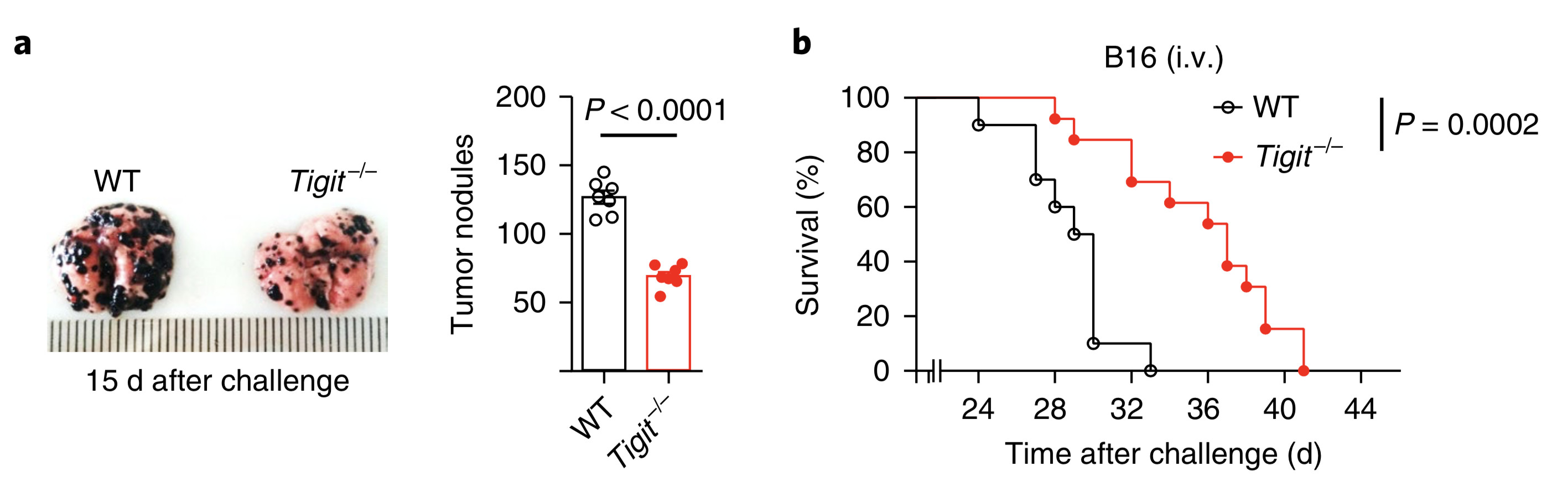 ? ? ? 于是研究人員把黑色素瘤細胞注射到Tigit基因缺失(所有細胞都不表達TIGIT了)的小鼠體內(nèi),效果很神奇。與Tigit基因正常的小鼠相比,只有非常少的Tigit缺陷小鼠出現(xiàn)了肺轉(zhuǎn)移,Tigit缺陷小鼠的總體生存率顯著延長。