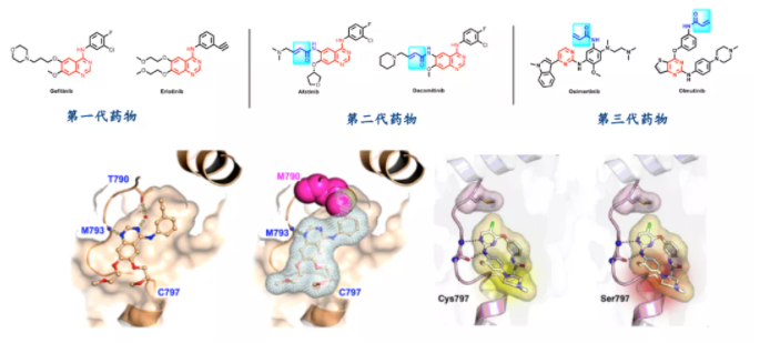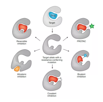 ? ? ? ?但是道高一尺,魔高一丈。狡猾的癌細(xì)胞豈能是任人刀俎的魚肉。產(chǎn)生耐藥性是它們抗?fàn)幍淖钪苯拥谋憩F(xiàn)。比如非小細(xì)胞肺癌的治療,由于癌細(xì)胞的靶點(diǎn)產(chǎn)生耐藥突變,不得不使靶向藥物升級(jí)換代,目前為止已經(jīng)經(jīng)歷了三代藥物的更迭(下圖),不幸的是,第三代針對(duì)T790M突變藥物奧希替尼也產(chǎn)生了突變,目前面臨沒有新的靶向藥物更換的尷尬局面。再比如費(fèi)城染色體易位的慢性骨髓性白血病,在經(jīng)歷第一代靶向神藥格列衛(wèi)突變后,第二代,第三代的藥物應(yīng)用而生,比如尼洛替尼,氟馬替尼等。 ? ? ? ?其實(shí)除了靶點(diǎn)突變的耐藥機(jī)制以外,癌細(xì)胞進(jìn)化出了各種神奇的耐藥機(jī)制。比如表達(dá)排出藥物的泵系統(tǒng),俗稱吃了吐。還有會(huì)進(jìn)化出減毒的機(jī)制,讓毒性的藥物變成無毒的藥物,以及改變了自身的繁殖方式等等都會(huì)產(chǎn)生對(duì)當(dāng)前藥物的抵抗性。最近一篇Science文章指出腫瘤在進(jìn)行化療時(shí)會(huì)累積DNA損傷,并會(huì)增加基因突變的概率,最終少部分腫瘤細(xì)胞會(huì)被篩選出來從而進(jìn)化出各種耐藥性。 ? ? ? ?當(dāng)癌癥靶向藥物遭遇耐藥后,科學(xué)家也并不是束手無策,病人也更不會(huì)束手就擒,針對(duì)耐藥性本篇文章總結(jié)了常見五種針對(duì)耐藥性的策略(下圖)。下面將一一進(jìn)行解讀。 ▉ 設(shè)計(jì)具有獨(dú)特結(jié)合模式的抑制劑(1)