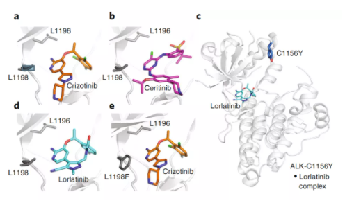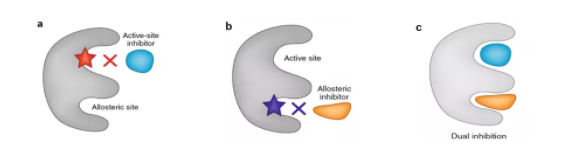 ? ? ? ? ALK陽性的肺癌患者治療要首選靶向藥,也就是ALK激酶抑制劑。2011年,克唑替尼(Crizotinib)成為第一個(gè)ALK抑制劑,獲得FDA批準(zhǔn)用于ALK陽性的NSCLC的一線治療,也問世中國(guó)臨床多年。雖然有效,但許多患者在治療約1年后通常會(huì)發(fā)生耐藥(L1196M)。針對(duì)該突變,研發(fā)出第二代的藥物,2017年FDA批準(zhǔn)了能夠替代克唑替尼的ALK抑制劑-色瑞替尼(ceritinib)。但后續(xù)由于檢測(cè)到ALK基因繼發(fā)突變(C1156Y),該突變提示對(duì)第二代靶向藥ceritinib不敏感,但卻是第三代靶向藥lorlatinib的有效靶點(diǎn)。Lorlatinib治療持續(xù)8個(gè)月有效后,癌癥復(fù)發(fā),基因檢測(cè)發(fā)現(xiàn),不僅有ALK C1156Y突變,還出現(xiàn)了新的ALK L1198F突變。但是有意思的是,L1198F突變會(huì)介導(dǎo)產(chǎn)生lorlatinib耐藥,但卻可以增強(qiáng)第一代ALK靶向藥crizotinib的作用,這種增效作用足以勝過原有的C1156Y突變相關(guān)耐藥。所以,患者又從第三代lorlatinib及時(shí)換回到第一代crizotinib治療,收獲了較好的效果。 ? ? ? ?著名醫(yī)學(xué)雜志《New England Journal of Medicine》刊登了這個(gè)經(jīng)典的案例,所以在全程ALK靶向藥治療中,一旦發(fā)生耐藥則基于耐藥基因?qū)崟r(shí)監(jiān)測(cè)指導(dǎo)下,從第一代吃到第三代,再換回吃第一代,通過輪換靶向藥成功克服了耐藥。 ▉ 設(shè)計(jì)共價(jià)結(jié)合模式的抑制劑(2) ? ? ? ?過去十年里,NSCLC (非小細(xì)胞肺癌)治療方案中最顯著的改變可能就是 EGFR 酪氨酸激酶抑制劑用于具有 EGFR 靶向性驅(qū)動(dòng)突變患者一線治療。其中設(shè)計(jì)開發(fā)的共價(jià)抑制劑是一大亮點(diǎn)和突破。以EGFR為靶標(biāo)的第一代非共價(jià)抑制劑,如吉非替尼, 厄洛替尼。對(duì)治療EGFR~(L858R)突變的NSCLC患者有良好的療效。然而,在接受EGFR抑制劑治療8-14個(gè)月后,約60%的患者發(fā)生了T790M突變并產(chǎn)生耐藥性。 ? ? ? ?以前大部分的抑制劑是可逆的,科學(xué)家腦洞大開,是否可以利用激酶中具有親核功能的基團(tuán)比如巰基,設(shè)計(jì)含有親電基團(tuán)的共價(jià)抑制劑呢?于是第二代共價(jià)EGFR抑制劑橫空出世,如阿法替尼和達(dá)克替尼,被開發(fā)用于治療EGFR~(L858R)突變和T790M耐藥突變的NSCLC患者。但這些抑制劑對(duì)EGFR~(T790M)突變型和野生型EGFR激酶之間缺乏選擇性 ,因而會(huì)產(chǎn)生較強(qiáng)的毒副作用。2018年,F(xiàn)DA批準(zhǔn)了第三代共價(jià)EGFR抑制劑,如奧希替尼(泰瑞沙),對(duì)EGFR~(WT)活性較弱,而對(duì)EGFR~(T790M)具有較高的活性及選擇性,減輕了毒副作用。然而,接受其治療的三分之一患者出現(xiàn)了C797S突變并產(chǎn)生耐藥性,也就是把能夠發(fā)生共價(jià)反應(yīng)的巰基突變成了羥基(就不讓你反應(yīng))。目前針對(duì)該突變尚未有合適的靶向藥,如果產(chǎn)生耐藥了,患者可能就要考慮傳統(tǒng)的化療藥物。 ▉ 設(shè)計(jì)變構(gòu)結(jié)合模式的抑制劑(3) ? ? ? ?變構(gòu)效應(yīng)長(zhǎng)期以來都被應(yīng)用于調(diào)節(jié)正構(gòu)效應(yīng)難以靶向的藥物靶標(biāo),近年來,它被逐步應(yīng)用到蛋白相互作用的調(diào)節(jié)當(dāng)中。通過變構(gòu)效應(yīng)調(diào)節(jié)蛋白相互作用已經(jīng)成為創(chuàng)新藥物研發(fā)領(lǐng)域的熱點(diǎn)。變構(gòu)劑保守性低于ATP結(jié)合位點(diǎn),選擇性高,并具有額外的有利性質(zhì)。當(dāng)靶點(diǎn)具有雙重結(jié)合位點(diǎn)(活性位點(diǎn)和變構(gòu)位點(diǎn))時(shí),在單獨(dú)給藥產(chǎn)生耐藥突變后,可選擇另外一個(gè)位點(diǎn)的靶向藥物,如上圖a,b.? 如果靶向兩個(gè)結(jié)合位點(diǎn)會(huì)怎么樣呢?上圖c所示,雙重抑制(雞尾酒療法)會(huì)不會(huì)產(chǎn)生1+1>2的效果,會(huì)不會(huì)克服耐藥性的產(chǎn)生呢? ? ? ? ?最近有研究,在慢性粒細(xì)胞白血病(CML)的治療中采用一種新的ABL1激酶變構(gòu)抑制劑ABL001可以和第二代TKI類藥物尼羅替尼聯(lián)用,在小鼠模型中可以起到根治CML的效果。與靶向作用于ATP結(jié)合位點(diǎn)的TKI類藥物不同,ABL001作用于正常ABL1蛋白起自我抑制作用的N端豆蔻酰化的帽子結(jié)構(gòu)(MC)的作用位點(diǎn),從而起到變構(gòu)抑制激酶活性的作用。有資料顯示,單用ABL001已經(jīng)可以取得比伊馬替尼(格列衛(wèi))更好的效果。但可能更好的信息是相比較使用任意一種藥物產(chǎn)生突變的現(xiàn)象,聯(lián)合這兩種藥物的抗突變的能力較強(qiáng),產(chǎn)生突變的概率更低。 ▉ 設(shè)計(jì)雙價(jià)結(jié)合模式的抑制劑(4) mTOR是人類癌癥中都很活躍的細(xì)胞信號(hào)通路,科學(xué)家們已經(jīng)發(fā)展了以天然產(chǎn)物雷帕霉素的類似物第一代藥物比如:依維莫司和西羅莫司等藥物來抑制這條通路。這些藥物靶向mTOR上的雷帕霉素結(jié)合位點(diǎn)(FRB)。但是不幸的是大多會(huì)產(chǎn)生耐藥突變,比如A2034V以及F2108L突變。針對(duì)該突變,開發(fā)了第二代mTOR抑制劑,比如AZD8055,MLN0128。它們是通過靶向另一個(gè)三磷酸腺苷(ATP)活性位點(diǎn)發(fā)揮功能。一些第二代抑制劑已經(jīng)進(jìn)入到臨床試驗(yàn)階段。不幸的是,癌細(xì)胞依然會(huì)產(chǎn)生耐藥性,第二代mTOR抑制劑也難逃失效的命運(yùn)。 ? ? ? ?之前研究者發(fā)現(xiàn)mTOR上的兩個(g
