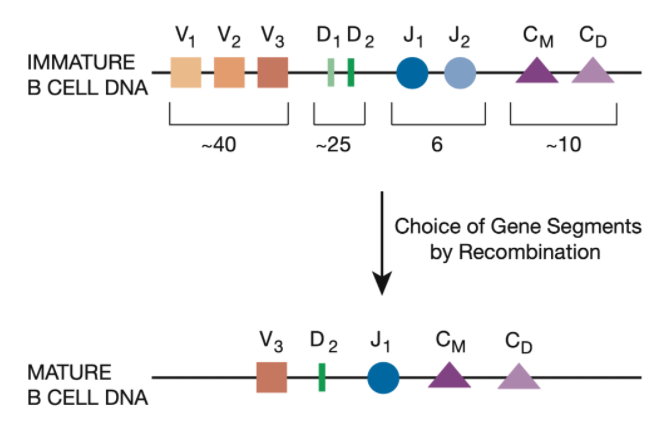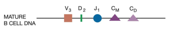 ? ? ? ?在這個紙牌游戲中,14號染色體玩家首先選擇一個可能的D和J片段,然后通過刪除他們之間的DNA序列將他們兩個片段相連接,然后再從眾多V片段中選擇其中一個V片段,通過刪除V片段與DJ片段之間的DNA序列將V片段連接到DJ片段上。緊挨著J片段的是編碼各種恒定區(qū)的基因片段(CM、CD等)。默認情況下,IgM和IgD的恒定區(qū)被用來產生 BCR,因為它們位于線性排列的前端。免疫學家把這種基因片段的連接稱之為基因重排,但它實際上更多的是剪切和粘貼而不是重排。無論如何,結果是所選擇的 V、D、J 基因片段和恒定區(qū)基因片段在14號染色體上彼此相鄰。 所選擇的 V、D、J 基因片段和恒定區(qū)基因片段在14號染色體上彼此相鄰