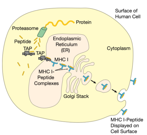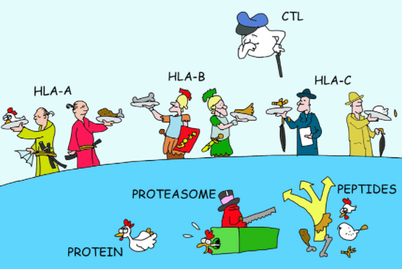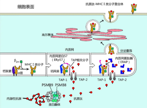 MHC I類分子介導(dǎo)的內(nèi)源性抗原呈遞過程(中文版) ? ? ? ?盡管不同的細(xì)胞表達(dá)的MHC I類分子數(shù)量各異,但人體內(nèi)幾乎所有的細(xì)胞均在表面表達(dá)MHC I類分子。細(xì)胞毒性T淋巴細(xì)胞(CTL)會審查由MHC I類分子展示的蛋白質(zhì)多肽片段,因此幾乎每一個細(xì)胞都像是一本“打開的書”,均可被 CTL 檢查以確定該細(xì)胞是否被病毒或其他生物侵襲,從而決定是否應(yīng)該破壞之。 ▉ 小結(jié) ? ? ? ?本期推送中,我們?yōu)榇蠹医榻B了MHC I類分子的結(jié)構(gòu)和由其介導(dǎo)的內(nèi)源性抗原的抗原呈遞過程。MHC分子能呈遞約由8-11個氨基酸組成的內(nèi)源性抗原的多肽片段,MHC I類分子展示的有 3 個重要步驟:由蛋白酶體裂解產(chǎn)生抗原多肽;由TAP轉(zhuǎn)運(yùn)體將多肽轉(zhuǎn)運(yùn)至內(nèi)質(zhì)網(wǎng);多肽結(jié)合于MHC I類分子結(jié)合溝內(nèi)并被運(yùn)至細(xì)胞表面展示。相信大家現(xiàn)在對MHC I類分子已經(jīng)有了充分的了解,下一期推送中我們將為大家介紹MHC II類分子。 ? ? ??如涉及知識產(chǎn)權(quán)請與我司聯(lián)系