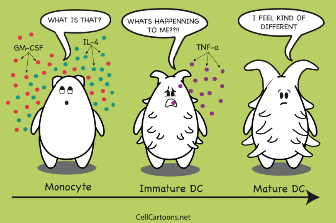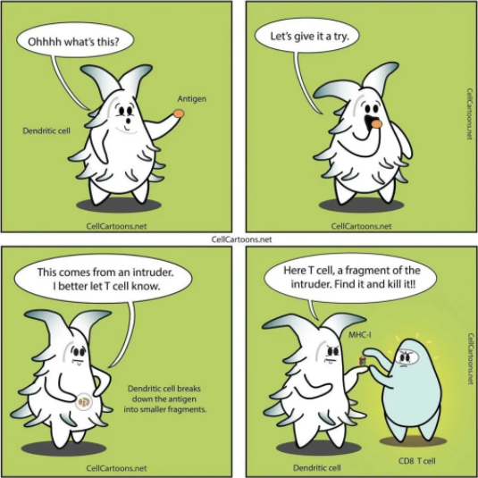 ? ? ? ?來(lái)源:藥學(xué)速覽 ▉ 導(dǎo)讀 ? ? ? ?前兩期,我們?yōu)榇蠹医榻B了MHC I類(lèi)分子和MHC II類(lèi)分子的結(jié)構(gòu)、功能和作用機(jī)制。我們知道,在CTL(殺傷性T細(xì)胞,cytotoxic T cell)和Th(輔助性T細(xì)胞,helper T cell)行使功能之前,它們都必須先被激活——T細(xì)胞除了能識(shí)別由MHC分子呈遞的抗原外,還需要接受共刺激信號(hào)。只有某些特定的細(xì)胞可以表達(dá)MHC I類(lèi)和II類(lèi)分子、協(xié)同刺激信號(hào)分子和各種粘附分子,這就是我們今天這期推送所要介紹的主角——抗原呈遞細(xì)胞(Antigen-presenting cells, APC)。 ▉ 抗原呈遞細(xì)胞 ? ? ? ?抗原呈遞細(xì)胞(APC)的工作職責(zé)就是激活CTL和Th,它們能夠加工抗原并以抗原肽-MHC分子復(fù)合物的形式將抗原肽呈遞給T細(xì)胞(需要注意的是,體內(nèi)大部分細(xì)胞都能夠表達(dá)MHC I類(lèi)分子,而這里所介紹的APC是指一類(lèi)特殊的細(xì)胞,能夠提供T細(xì)胞激活所需的高水平的MHC分子及共刺激信號(hào))。 ? ? ? ?抗原呈遞細(xì)胞與T細(xì)胞間共刺激信號(hào)傳遞的過(guò)程涉及到存在于抗原提呈細(xì)胞表面的B7蛋白和T細(xì)胞表面的CD28蛋白,B7蛋白可以與CD28蛋白相結(jié)合,從而傳遞共刺激信號(hào)。 抗原呈遞細(xì)胞(左)與輔助性T細(xì)胞(右) ? ? ? ?抗原提呈細(xì)胞可以分為三類(lèi),分別是:樹(shù)突狀細(xì)胞、巨噬細(xì)胞和B細(xì)胞,這三類(lèi)細(xì)胞都是白細(xì)胞,來(lái)源于骨髓組織,出骨髓后遷移至機(jī)體各個(gè)部位,它們?cè)谄湫惺箍乖岢使δ苤氨仨毐患せ?。接下?lái)我們將為大家一一細(xì)述上述三類(lèi)抗原提呈細(xì)胞。 三種抗原提呈細(xì)胞:樹(shù)突狀細(xì)胞(左)、巨噬細(xì)胞(中)、B細(xì)胞(右) ▉ 樹(shù)突狀細(xì)胞(dendritic cell) ? ? ? ?樹(shù)突狀細(xì)胞,顧名思義,是由于該細(xì)胞成熟時(shí)伸出許多樹(shù)突狀或偽足樣突起而得名。在靜息狀態(tài)時(shí),樹(shù)突狀細(xì)胞表面有低水平表達(dá)的MHC分子和B7分子,因此靜息態(tài)樹(shù)突狀細(xì)胞并不擅長(zhǎng)呈遞抗原給T細(xì)胞(尤其是初始T細(xì)胞,因?yàn)橐せ畛跏糡細(xì)胞需要有由MHC-多肽復(fù)合體及強(qiáng)的共刺激介導(dǎo)的大量受體交聯(lián))。 A dendritic cell (blue) engages a T cell (yellow) ? ? ? ?靜息狀態(tài)樹(shù)突狀細(xì)胞內(nèi)有大量的MHC II類(lèi)分子正等候著被裝載。一旦有微生物入侵,樹(shù)突狀細(xì)胞定居的組織將成為戰(zhàn)場(chǎng),它們也因被激活而將發(fā)生顯著變化。這些“儲(chǔ)備”的MHC II類(lèi)分子與來(lái)自戰(zhàn)區(qū)的抗原裝載,樹(shù)突狀細(xì)胞離開(kāi)組織,經(jīng)由淋巴系統(tǒng)遷移至最近的淋巴結(jié)。正是這種“一經(jīng)戰(zhàn)斗信號(hào)刺激即游走”的能力使得樹(shù)突狀抗原提呈細(xì)胞如此特別。當(dāng)樹(shù)突狀細(xì)胞抵達(dá)目的地時(shí),這些裝載抗原的MHC II類(lèi)分子被展示于樹(shù)突狀細(xì)胞表面。同時(shí)在向淋巴結(jié)游走過(guò)程中,樹(shù)突狀細(xì)胞將上調(diào)MHC I類(lèi)分子的表達(dá)(因此,如果樹(shù)突狀細(xì)胞在戰(zhàn)區(qū)被病毒感染入侵,那么它們?cè)诘竭_(dá)淋巴結(jié)時(shí),由這些侵襲者產(chǎn)生的蛋白片段可以由MHC I類(lèi)分子有效提呈)。最后,在樹(shù)突狀細(xì)胞移行過(guò)程中,它們會(huì)增加B7共刺激蛋白表達(dá)。所以,當(dāng)?shù)诌_(dá)淋巴結(jié)時(shí),激活的樹(shù)突狀細(xì)胞已具備激活初始T細(xì)胞所必需的一切條件——高水平的MHC I類(lèi)和II類(lèi)分子及足夠量的 B7 蛋白。 關(guān)于樹(shù)突狀細(xì)胞的三個(gè)階段:“取樣者”——“載貨游走者”——“呈遞者” ? ? ? ?舉個(gè)例子來(lái)更清晰地說(shuō)明上述過(guò)程。樹(shù)突狀細(xì)胞以“快照”的形式抓拍正在前線戰(zhàn)場(chǎng)發(fā)生的事情,并把這些圖像帶到淋巴結(jié)。由于淋巴結(jié)是T細(xì)胞經(jīng)常去的“約會(huì)酒吧”,游走的樹(shù)突狀細(xì)胞可以將從戰(zhàn)區(qū)攜帶的圖像帶至初始T 細(xì)胞的聚集點(diǎn)并激活它們。而諸如TNF等細(xì)胞因子可激發(fā)樹(shù)突狀細(xì)胞遷移至淋巴結(jié)。總而言之,只要戰(zhàn)斗還在繼續(xù),機(jī)體就需要樹(shù)突狀細(xì)胞游走并提呈抗原。 樹(shù)突狀細(xì)胞向T細(xì)胞呈遞抗原的過(guò)程的卡通示意圖 ? ? ? ?當(dāng)細(xì)胞因子激活樹(shù)突狀細(xì)胞后(例如在戰(zhàn)場(chǎng)中的巨噬細(xì)胞所分泌的TNF),樹(shù)突狀細(xì)胞遷移至臨近的淋巴結(jié)。如果感染嚴(yán)重,會(huì)產(chǎn)生大量的細(xì)胞因子,大量的樹(shù)突狀細(xì)胞就會(huì)被激活并開(kāi)始遷移。在離開(kāi)組織之前,樹(shù)突狀細(xì)胞還能產(chǎn)生的特殊的細(xì)胞因子(亦稱趨化因子)來(lái)影響前體細(xì)胞 (單核細(xì)胞),使其離開(kāi)血液,進(jìn)入組織,成為樹(shù)突狀細(xì)胞——激活的樹(shù)突狀細(xì)胞可募集自身替代者!這些新抵達(dá)的樹(shù)突狀細(xì)胞繼而被激活,并被派遣至淋巴結(jié),從而擴(kuò)大了針對(duì)入侵的免疫應(yīng)答。 ? ? ? ?另一種情況,當(dāng)感染并不嚴(yán)重時(shí),則細(xì)胞因子的產(chǎn)生相對(duì)較少,相應(yīng)地,較少的樹(shù)突狀細(xì)胞參與游走,替換補(bǔ