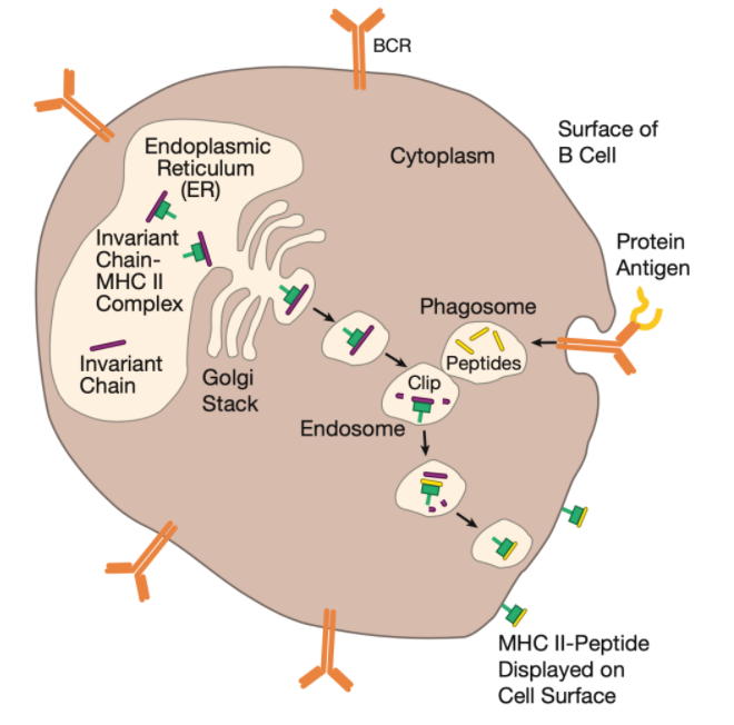 ▉ 巨噬細(xì)胞 巨噬細(xì)胞“消化”抗原的過(guò)程 ? ? ? ?巨噬細(xì)胞也是守衛(wèi)機(jī)體安全的“哨兵”,它們具有多種功能,比如垃圾收集、抗原呈遞或具有強(qiáng)大的殺傷功能。在靜息狀態(tài)時(shí),巨噬細(xì)胞擅長(zhǎng)于清理保潔,而不擅于提呈抗原——這是因?yàn)榫奘杉?xì)胞只有被如 IFN-γ等細(xì)胞因子激活后,才能夠表達(dá)足夠水平的 MHC 和共刺激信號(hào)分子,發(fā)揮其抗原提呈的功能。因而,和樹(shù)突狀細(xì)胞一樣,只有當(dāng)某種危險(xiǎn)信號(hào)存在時(shí),巨噬細(xì)胞才能有效地提呈抗原。但與樹(shù)突狀細(xì)胞不同的是,巨噬細(xì)胞并不游走(通過(guò)上一期推送我們知道,樹(shù)突狀細(xì)胞被激活后會(huì)游走到最近的淋巴結(jié)處激活T細(xì)胞)。舉個(gè)例子,樹(shù)突狀細(xì)胞就像是“戰(zhàn)地記者” ,拍攝快照以記錄信息,然后離開(kāi)戰(zhàn)區(qū)去播報(bào)它所記錄的“作戰(zhàn)信息”;而巨噬細(xì)胞則像士兵一樣,必須站崗、戰(zhàn)斗(在抵抗入侵者的早期過(guò)程中,巨噬細(xì)胞是機(jī)體對(duì)付入侵者的主要武器之一)。讀到這里,你可能想問(wèn):既然巨噬細(xì)胞缺乏游走能力,不能游走至初始T細(xì)胞聚集的淋巴結(jié)處,那么它抗原提呈的優(yōu)勢(shì)在哪? 巨噬細(xì)胞激活T細(xì)胞示意圖 ? ? ? ?下面我來(lái)回答大家這個(gè)問(wèn)題:一旦被樹(shù)突狀細(xì)胞激活,T 細(xì)胞將離開(kāi)淋巴結(jié),進(jìn)入炎癥部位,協(xié)助戰(zhàn)斗。值得注意的是,這些活化的 T 細(xì)胞必須連續(xù)不斷地被再刺激才能發(fā)揮特定的功能——否則,在沒(méi)有被持續(xù)刺激的情況下,它們會(huì)認(rèn)為戰(zhàn)爭(zhēng)已經(jīng)勝利并回到靜息態(tài)或自生自滅。所以,激活的巨噬細(xì)胞在組織中扮演著“加油站”的角色,保持著 T 細(xì)胞被持續(xù)激活,使它們持續(xù)參與戰(zhàn)斗。因此,樹(shù)突狀細(xì)胞在淋巴結(jié)處激活初始T 細(xì)胞,而激活的巨噬細(xì)胞的則再刺激先前已經(jīng)被激活過(guò)的 T 細(xì)胞。 ▉ B細(xì)胞 ? ? ? ?第三類專職APC是激活的B細(xì)胞。和前面所提到的一樣,僅低水平表達(dá) MHC II類分子和B7分子的初始B細(xì)胞并不擅長(zhǎng)抗原提呈。但一旦B 細(xì)胞被活化,其表面MHC II類分子及B7分子水平顯著上升。因此激活后的B 細(xì)胞能夠?yàn)門(mén)h細(xì)胞扮演抗原提呈細(xì)胞的角色。所以,在感染的初始階段,B細(xì)胞并不能作為 APC(因?yàn)楫?dāng)時(shí)它們還處于初始階段,尚未被激活),但是在感染后期或繼發(fā)感染過(guò)程中,由激活的B細(xì)胞介導(dǎo)的抗原提呈則起著重要的作用。 ? ? ? ?與其他 APC 相比,B 細(xì)胞具有一個(gè)顯著的優(yōu)勢(shì):它們可以聚集抗原以提呈。B 細(xì)胞與同源抗原結(jié)合后,BCR 與抗原形成的整個(gè)復(fù)合體將移離細(xì)胞表面而進(jìn)入細(xì)胞內(nèi),隨后抗原多肽被加工并被裝載于MHC II類分子上,進(jìn)而轉(zhuǎn)運(yùn)至細(xì)胞表面提呈。(具體的抗原多肽在體內(nèi)被加工并被裝載在MHC II類分子上后被轉(zhuǎn)運(yùn)至細(xì)胞表面呈遞的過(guò)程可見(jiàn)“人人學(xué)懂免疫學(xué):第十六期”) B細(xì)胞抗原呈遞的過(guò)程 ? ? ? ?由于B細(xì)胞受體(關(guān)于BCR的更多內(nèi)容可以參見(jiàn)“人人學(xué)懂免疫學(xué):第九期”)對(duì)抗原具有很高的親和力,這些受體像磁鐵一樣可以富集抗原并提呈至T細(xì)胞——因此當(dāng)周圍抗原量相對(duì)很低時(shí),B細(xì)胞相比其他APC而言就很占優(yōu)勢(shì)。此外,由B細(xì)胞介導(dǎo)的抗原提呈過(guò)程十分迅速,從抗原被B細(xì)胞受體捕獲至由 MHCII類分子介導(dǎo)抗原被展示于細(xì)胞表面,不超過(guò)半小時(shí)! ▉ 小結(jié) ? ? ? ?通過(guò)這兩期推送,我們?cè)敿?xì)地為大家介紹了APC的成員:激活的樹(shù)突狀細(xì)胞、巨噬細(xì)胞和B細(xì)胞。讓我們來(lái)再次復(fù)習(xí)一下APC發(fā)揮抗原呈遞作用的整個(gè)過(guò)程:當(dāng)機(jī)體首次遭遇入侵者時(shí),能識(shí)別入侵者的所有B細(xì)胞均為初始B細(xì)胞,此時(shí)最重要的APC是激活的樹(shù)突狀細(xì)胞,他們能夠把戰(zhàn)場(chǎng)中的信息帶到最近的淋巴結(jié)并激活初始T細(xì)胞。當(dāng)戰(zhàn)斗越來(lái)越激烈時(shí), 激活的巨噬細(xì)胞將提呈抗原至作戰(zhàn)T細(xì)胞,通過(guò)再刺激,使T細(xì)胞保持“打滿氣加足油” 狀態(tài)。如果再次遭遇同樣的入侵者的入侵,首次攻擊后余留的有經(jīng)驗(yàn)的記憶B細(xì)胞將成為最重要的APC,因?yàn)樗鼈兡芡ㄟ^(guò)聚集少量抗原來(lái)快速激活T細(xì)胞,推進(jìn)獲得性免疫應(yīng)答。