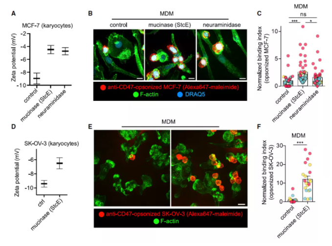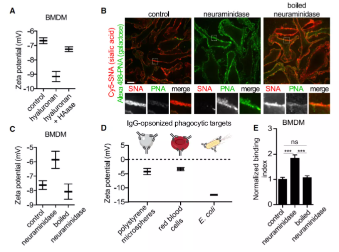 ? ? ? ?來源:生物360 ? ? ? ?糖萼 ? ? ? ?糖萼(glycocalyx)是一種凝膠層,由糖脂、糖蛋白和表面相關(guān)的糖胺聚糖組成,包圍著所有哺乳動(dòng)物細(xì)胞的質(zhì)膜。? ? ? ? ?功能:除了保持膜完整性,糖萼還充當(dāng)擴(kuò)散屏障,限制(過濾)溶液中分子與膜之間的接觸。細(xì)胞類型之間糖萼的厚度和組成可能有很大差異,表現(xiàn)出顯著的極化(例如在上皮和內(nèi)皮組織中),在炎癥等環(huán)境下,受到酶調(diào)節(jié)以改變其屏障功能。 ? ? ? ?“吃我”和“別吃我”信號(hào) ? ? ? ?除了掃描“吃我”的信號(hào),吞噬細(xì)胞還識(shí)別表面分子(CD47-SIRPA;PD-L1-PD-1,CD24-Siglec-10),作為不吃我的信號(hào),抑制吞噬。 吃我和別吃我信號(hào)(文獻(xiàn)1) ? ? ? ?當(dāng)抑制性受體結(jié)合配體后,通過招募胞漿磷酸酶,抑制吞噬信號(hào),阻斷信號(hào)通路。在抗炎環(huán)境中,細(xì)胞因子上調(diào)抑制性受體; 相反,促炎介質(zhì)可以激發(fā)或刺激吞噬受體。 “吃我”和“別吃我”信號(hào)受到糖萼調(diào)節(jié) ? ? ? ?有一個(gè)問題,研究者比較容易忽略:感受“吃我”和“不吃我”的受體只有大約5nm,因此需要與目標(biāo)細(xì)胞密切接觸才能結(jié)合,而這種接觸會(huì)受到糖萼厚度的影響。 ? ? ? ?病原微生物和腫瘤細(xì)胞可以通過糖胺聚糖和糖蛋白掩蓋配體,而巨噬細(xì)胞自合成或獲得外來的糖萼成分也可以包裹受體,阻斷“吃我”和“別吃我”信號(hào)。 ? ? ? ?通過酶分解糖萼,可以恢復(fù)巨噬細(xì)胞對(duì)外源性病原微生物和惡性腫瘤細(xì)胞的吞噬能力。 ? ? ? ?Current Biology刊發(fā)了此項(xiàng)研究成果:An Acquired and Endogenous Glycocalyx Forms aBidirectional "Don't Eat" and "Don't Eat Me"Barrier to Phagocytosis 圖片源于文獻(xiàn)2 結(jié)果舉例 1. 巨噬細(xì)胞表面被外源性糖萼(透明質(zhì)酸/Hyaluronan,HA)包裹,阻斷吞噬,降低Zeta電勢(shì)。 圖片源于文獻(xiàn)2 2. 靶細(xì)胞包裹糖萼(mucin),可以避免被巨噬細(xì)胞吞噬(Zeta點(diǎn)位低)。加入mucinase酶裂解Mucin,可以恢復(fù)吞噬(Zeta電勢(shì)升高) 圖片源于文獻(xiàn)2 ? ? ??如涉及知識(shí)產(chǎn)權(quán)請(qǐng)與我司聯(lián)系