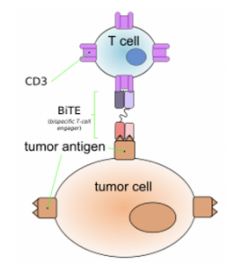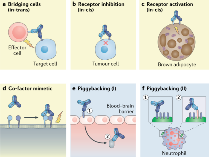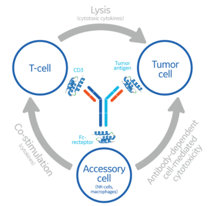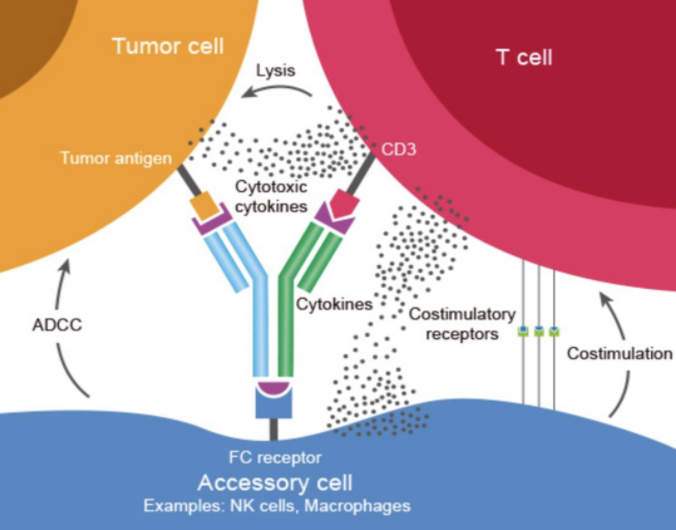 Examples of obligate mechanisms of action of bsAbs. 橋連細(xì)胞——T細(xì)胞招募 ? ? ? ?最初雙抗就是用于T細(xì)胞重定向的,利用雙抗橋連T細(xì)胞與腫瘤細(xì)胞,通過(guò)結(jié)合TCR復(fù)合物中的CD3e使T細(xì)胞可以繞開(kāi)MHC分子直接活化,活化后的T細(xì)胞通過(guò)釋放穿孔素,顆粒酶等殺傷腫瘤細(xì)胞。盡管這種想法在體外已經(jīng)被驗(yàn)證,但是卻沒(méi)有持續(xù)的臨床效果。由于并發(fā)癥以及雙抗本身不穩(wěn)定,后續(xù)雙抗開(kāi)發(fā)受阻。在此不得不提到安進(jìn)的blinatumomab,該抗體的出現(xiàn)極大的推動(dòng)了整個(gè)領(lǐng)域的發(fā)展。該雙抗是單鏈抗體,不含F(xiàn)c段,僅有55kDa,血漿半衰期1.25±0.63小時(shí)。當(dāng)通過(guò)連續(xù)靜脈注射達(dá)到低谷水平時(shí),NHL病人顯示出較好的響應(yīng),對(duì)于復(fù)發(fā)及難治ALL,其完全緩釋率達(dá)到43%。 影響T細(xì)胞殺傷的因素,主要分為幾個(gè),腫瘤靶點(diǎn)與T細(xì)胞的距離將直接影響免疫突觸的形成,而這與T細(xì)胞最終在體內(nèi)進(jìn)行有效殺傷直接相關(guān)。二價(jià)的靶點(diǎn)結(jié)合由于提高了對(duì)靶點(diǎn)結(jié)合的親和力,可以增強(qiáng)T細(xì)胞對(duì)腫瘤的殺傷,目前羅氏有一款1+2雙抗,在I期臨床展示出非常好的效果。這種雙抗在設(shè)計(jì)時(shí),應(yīng)充分考慮到CD3一端的親和力,過(guò)高的親和力會(huì)讓雙抗占住細(xì)胞CD3的抗原,持續(xù)活化該細(xì)胞,最終導(dǎo)致T細(xì)胞耗竭,而低親和力會(huì)使雙抗不斷與不同細(xì)胞的CD3結(jié)合并解離,與T細(xì)胞的反復(fù)結(jié)合產(chǎn)生瀑布效應(yīng)可以使T細(xì)胞成簇,最終導(dǎo)致大量的T細(xì)胞活化,最終殺傷腫瘤細(xì)胞。另外,CD3親和力過(guò)高,會(huì)讓雙抗更集中在脾臟等組織,從而難以抵達(dá)腫瘤組織,相當(dāng)于分散了火力。 Bi-specific T-cell engager,wikipedia