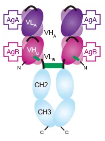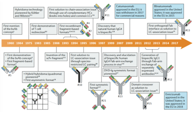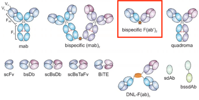 ? ? ? ?來(lái)源:藥學(xué)速覽 ▉ 導(dǎo)讀 圖片來(lái)源:cytivalifesciences ? ? ? ?雙特異性抗體(Bispecific antibody,BsAb),一般來(lái)講是指一種可以特異性結(jié)合兩個(gè)抗原或者同一個(gè)抗原的兩個(gè)不同表位的抗體。今天,我們來(lái)簡(jiǎn)單的瀏覽一下關(guān)于雙抗的那些知識(shí),主要從構(gòu)型以及作用機(jī)制和未來(lái)趨勢(shì)三大塊來(lái)介紹。 ▉ 雙特異性抗體的構(gòu)型 ? ? ? ?雙抗構(gòu)型(format),主要分為三大類: ? ? ? ?第一類是由抗原結(jié)合區(qū)域(Fab)組裝起來(lái)的融合蛋白,可以避免輕重鏈錯(cuò)配等問(wèn)題,同時(shí)由于不含有糖基化修飾的Fc段,可以使用相對(duì)簡(jiǎn)單的原核或者低等的哺乳動(dòng)物細(xì)胞來(lái)進(jìn)行生產(chǎn),高產(chǎn)且成本低。不含F(xiàn)c段的缺點(diǎn)也是顯而易見(jiàn),由于無(wú)法與FcRn結(jié)合,在血漿中很快被清除,半衰期非常短,還有穩(wěn)定性和易聚集也是開(kāi)發(fā)時(shí)需要考慮的問(wèn)題。目前,該構(gòu)型有一款雙抗(Blinatumomab) 已上市。 structure of BsAb(圖中圈出的為上述介紹中的第一類構(gòu)型) 圖片來(lái)源:biying ? ? ? ?第二類是對(duì)稱型,在裸抗基礎(chǔ)上融合抗體片段,對(duì)稱型雙抗在分子量和結(jié)構(gòu)上與裸抗有區(qū)別,這有可能會(huì)導(dǎo)致穩(wěn)定性及可溶性等問(wèn)題。對(duì)稱型雙抗一般是采用四價(jià)2+2。這種抗體兩個(gè)抗原結(jié)合位置由于挨得比較近,可能會(huì)影響兩個(gè)靶點(diǎn)同時(shí)靠近,導(dǎo)致效價(jià)降低,對(duì)于這種分子可能后期還需要進(jìn)行優(yōu)化。 structure of? BsAb (2+2) 圖片來(lái)源:biying ? ? ? ?第三類是非對(duì)稱型構(gòu)型,也是目前大多數(shù)藥企為盡可能保留天然抗體性質(zhì)在開(kāi)發(fā)時(shí)采用的構(gòu)型。這種構(gòu)型模仿天然抗體,缺少非天然的抗體結(jié)構(gòu)域或者linker,被認(rèn)為是免疫原性最低的構(gòu)型。通常,非對(duì)稱型雙抗是二價(jià)1+1,也就是抗體以單價(jià)形式結(jié)合2個(gè)抗原,這種構(gòu)型的雙抗約占50%,其中1款Emicizumab已上市,一款上市后由于商業(yè)化原因退市(cartumaxomab),另有多個(gè)處于在臨床不同開(kāi)發(fā)階段。 structure of? BsAb (1+1) 圖片來(lái)源: biying structure of BsAb: a mechanistic revies of the pipeline, Nature Reviews, 2019 Bispecific antibodies: a mechanistic review of the pipeline ? ? ? ?TIPS:什么是效價(jià)(valency)? ? ? ? ?效價(jià)指抗體分子中抗原結(jié)合位點(diǎn)的數(shù)量。雙特異性抗體構(gòu)型的設(shè)計(jì)會(huì)影響每個(gè)靶標(biāo)的結(jié)合位點(diǎn)數(shù)量。每個(gè)靶標(biāo)具有一個(gè)結(jié)合位點(diǎn)的二價(jià)bsAb表示為1+1。摻入其他結(jié)合位點(diǎn)可導(dǎo)致三價(jià)(2+1)和四價(jià)(2+2或1+3)設(shè)計(jì)。 antibody format, biying Bispecific antibodies: a mechanistic review of the pipeline ▉ 雙特異性抗體的作用機(jī)制 ? ? ? ?目前雙抗的作用機(jī)理主要包括兩大類:橋接兩種細(xì)胞類型(in-transbinding)和結(jié)合一個(gè)細(xì)胞的兩個(gè)分子(in-cisbinding)。目前雙抗主流的治療領(lǐng)域主要分為抗腫瘤、自身免疫病及其他疾病三類,其中以抗腫瘤產(chǎn)品居多,而CD3T細(xì)胞銜接子雙抗又占了雙抗的半壁江山。