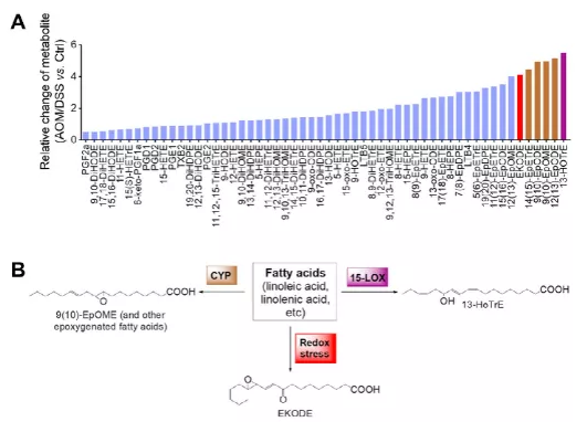 導(dǎo)讀 ? ? ? ?結(jié)直腸癌(CRC)是美國(guó)第三大常見癌癥,也是癌癥相關(guān)死亡的第二大原因。氧化應(yīng)激是包括結(jié)直腸癌在內(nèi)的許多人類疾病的共同特征,正在成為結(jié)直腸癌發(fā)展的重要因素。然而,氧化還原平衡失調(diào)促進(jìn)結(jié)直腸癌發(fā)生的分子機(jī)制仍不明確。為了識(shí)別結(jié)直腸癌的新致病因素,促進(jìn)診斷標(biāo)記物和/或干預(yù)目標(biāo)的開發(fā)以降低結(jié)直腸癌的風(fēng)險(xiǎn),更好地了解其潛在的機(jī)制是很重要的。 ? ? ? ?新出現(xiàn)的研究支持脂質(zhì)代謝產(chǎn)物,如脂肪酸的酶促代謝產(chǎn)物(如二十烷基類)和脂肪酸的非酶氧化產(chǎn)物(如脂質(zhì)過氧化產(chǎn)物)是調(diào)節(jié)炎癥和腫瘤發(fā)生的重要信號(hào)分子。為了系統(tǒng)地分析結(jié)直腸癌中脂質(zhì)代謝物是如何被解除調(diào)節(jié)的,作者進(jìn)行了基于液相色譜-串聯(lián)質(zhì)譜(LC-MS/MS)的脂質(zhì)組學(xué)研究,在已建立的偶氮甲烷(AOM)/右旋糖酐硫酸鈉(DSS)誘導(dǎo)的小鼠結(jié)直腸癌模型中,該方法可以檢測(cè)來自酶和非酶過程的100多種脂質(zhì)代謝物。在這里,作者發(fā)現(xiàn)環(huán)氧酮基十八烯酸(EKODE)是一種脂質(zhì)過氧化產(chǎn)物,與健康小鼠相比,AOM/DSS誘導(dǎo)的CRC小鼠結(jié)腸組織中的脂質(zhì)代謝產(chǎn)物顯著增加。作者假設(shè)EKODE的形成可能在氧化應(yīng)激和結(jié)腸癌發(fā)生之間提供一種新的機(jī)制聯(lián)系。到目前為止,EKODE對(duì)炎癥和癌癥的作用尚不清楚。為了驗(yàn)證作者的假設(shè),作者在動(dòng)物和細(xì)胞培養(yǎng)模型中確定了EKODE在調(diào)節(jié)結(jié)腸炎和結(jié)腸癌發(fā)生中的功能作用。