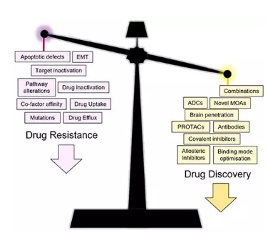 ? ? ? ?來源:藥學(xué)速覽 ? ? ? ?生存的進(jìn)化壓力推動(dòng)了耐藥性的出現(xiàn),從而對(duì)現(xiàn)代醫(yī)學(xué)提出了重大挑戰(zhàn)。耐藥性降低了藥物的有效時(shí)間,并限制了患者的治療選擇,在腫瘤學(xué)和傳染病的領(lǐng)域中發(fā)生藥物耐藥的機(jī)率很高。耐藥性的出現(xiàn)威脅著數(shù)百萬人的生命,并造成了沉重的經(jīng)濟(jì)負(fù)擔(dān),這促使人們制定新的策略來避免耐藥性。越來越多的藥物被發(fā)現(xiàn)出現(xiàn)耐藥,耐藥產(chǎn)生的機(jī)制有很多(圖1),在分子水平上,抗性通常與遺傳變化有關(guān),例如位點(diǎn)突變,缺失和基因擴(kuò)增,降低耐藥性的機(jī)制包括降低有效藥物濃度或消除生存對(duì)靶標(biāo)活性的依賴性等。從歷史上看,耐藥性最初是在治療HIV-1感染時(shí)發(fā)現(xiàn)的,在90年代末期,通過聯(lián)合治療直接作用抗病毒的多個(gè)靶點(diǎn)。藥物耐藥涉及到了許多領(lǐng)域,包括結(jié)構(gòu)生物學(xué),藥物化學(xué),酶學(xué),計(jì)算化學(xué),納米技術(shù),系統(tǒng)生物學(xué)等等,都可以用來鑒定耐藥性機(jī)制和篩選候選化合物。
