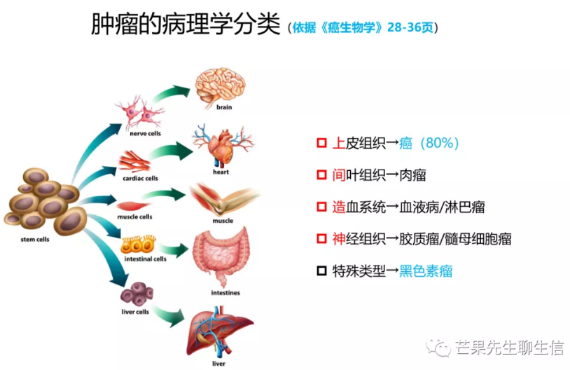 ? ? ? ?根據(jù)腫瘤組織來(lái)源,可以將腫瘤分為四類:上皮組織來(lái)源腫瘤,肉瘤,造血系統(tǒng)惡性腫瘤和神經(jīng)外胚層瘤。此外還有一些特殊腫瘤,如黑色素瘤、小細(xì)胞癌和畸胎瘤。 ? ? ? ?人類大多數(shù)腫瘤來(lái)源于上皮組織。上皮細(xì)胞是構(gòu)成體腔、管道和表皮的規(guī)則排列的層狀細(xì)胞。在上皮細(xì)胞之下是基底膜(有時(shí)稱基底層)。基底膜是細(xì)胞外基質(zhì)的一種特殊形式,主要由上皮細(xì)胞分泌的蛋白構(gòu)成。 ? ? ? ?上皮細(xì)胞來(lái)源的腫瘤最常見(jiàn),稱為癌。一些上皮細(xì)胞的主要作用是封閉腔穴或管道表面并保護(hù)其下層細(xì)胞,這種上皮細(xì)胞發(fā)展而來(lái)的癌稱為鱗狀細(xì)胞癌(簡(jiǎn)稱鱗癌)。 ? ? ? ?還有許多上皮組織中存在特殊的具有分泌能力的細(xì)胞,它們可以釋放分泌物到自身形成的導(dǎo)管或腔穴中,這種細(xì)胞來(lái)源的腫瘤稱為腺癌。在更多情況下,這些器官來(lái)源的腫瘤會(huì)包含鱗癌和腺癌兩種類型的癌細(xì)胞。 ? ? ? ?肉瘤 ? ? ? ?肉瘤來(lái)源于多種間質(zhì)細(xì)胞,包括分泌膠原的成纖維細(xì)胞及其相關(guān)結(jié)締組織細(xì)胞;脂肪細(xì)胞;成骨細(xì)胞和組成肌肉的肌細(xì)胞;相對(duì)多見(jiàn)于兒童的血管肉瘤是由血管內(nèi)皮細(xì)胞的前體細(xì)胞產(chǎn)生的。其中Oncomine、TIMER等數(shù)據(jù)庫(kù)提供了sarcoma的數(shù)據(jù),可用于生信分析。 ? ? ? ?造血系統(tǒng)惡性腫瘤 ? ? ? ?造血系統(tǒng)惡性腫瘤由各種組成造血系統(tǒng)的細(xì)胞轉(zhuǎn)化而來(lái)。白血病泛指造血細(xì)胞譜系的惡性衍生物。白血病的腫瘤細(xì)胞是散布在循環(huán)系統(tǒng)中的單細(xì)胞群,而淋巴系腫瘤則聚集在淋巴結(jié)形成實(shí)體瘤。血液病的診斷常用瑞特 (Wright) -吉姆薩 (Giemsa) 染色,簡(jiǎn)稱瑞吉染色,一般由檢驗(yàn)科細(xì)胞室完成;而實(shí)體腫瘤的組織染色常用蘇木精-伊紅染色法 (hematoxylin-eosin staining) ,簡(jiǎn)稱HE染色,是石蠟切片技術(shù)里常用的染色法之一,一般由病理科完成。 ? ? ? ?神經(jīng)外胚層瘤 ? ? ? ?由構(gòu)成中樞和外周神經(jīng)系統(tǒng)的各種細(xì)胞惡性轉(zhuǎn)化而致,包括膠質(zhì)瘤、膠質(zhì)母細(xì)胞瘤、神經(jīng)母細(xì)胞瘤、神經(jīng)鞘瘤和髓母細(xì)胞瘤。 ? ? ? ?特殊類型腫瘤? ? ? ? ?黑色素瘤來(lái)源于皮膚和視網(wǎng)膜中的黑色素細(xì)胞,而黑色素細(xì)胞則是由胚胎中的神經(jīng)脊發(fā)育而來(lái)。盡管與神經(jīng)外胚層細(xì)胞的發(fā)源地如此接近,但隨著發(fā)育過(guò)程,它卻最終落腳在了皮膚和眼睛的組織中,為其提供色素,而與神經(jīng)系統(tǒng)沒(méi)有任何直接聯(lián)系。 ? ? ? ?因此,總結(jié)來(lái)說(shuō),腫瘤就是一群來(lái)自正常組織、瘋長(zhǎng)不死的細(xì)胞。由于其瘋長(zhǎng)不死的本質(zhì)是基因組的改變,因此根據(jù)中心法則,腫瘤組織或細(xì)胞會(huì)產(chǎn)生某些特定成分如分泌蛋白、膜蛋白、外泌體、microRNA等質(zhì)量的變化,奠定體外診斷的基礎(chǔ)。同時(shí),基因組的變化(如p53、BRCA1/2等基因突變)可以通過(guò)PCR擴(kuò)增而測(cè)得。當(dāng)然,人體還存在著修復(fù)系統(tǒng),因此,罹患腫瘤是概率事件。
