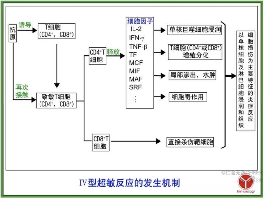 ▉ 導(dǎo)讀 ? ? ? ?好久沒見! ? ? ? ?超敏反應(yīng)是指集體對(duì)某些抗原初次應(yīng)答后,再次接受相同抗原刺激時(shí),發(fā)生的一種以集體生理功能紊亂或細(xì)胞損傷為主的特異性免疫應(yīng)答。超敏反應(yīng)分為四種,I型超敏反應(yīng)為速發(fā)型超敏反應(yīng),II型超敏反應(yīng)為細(xì)胞溶解型或細(xì)胞毒型超敏反應(yīng),III型超敏反應(yīng)為免疫復(fù)合物型或血管炎型超敏反應(yīng),IV型超敏反應(yīng)為遲發(fā)型超敏反應(yīng)。今天我們將為大家介紹由Th細(xì)胞發(fā)出“信號(hào)征集”的特殊例子——遲發(fā)型超敏反應(yīng)。 4種類型的超敏反應(yīng) ▉遲發(fā)型超敏反應(yīng) ? ? ? ?這種由Th細(xì)胞發(fā)出“信號(hào)征集”的例子,被稱為遲發(fā)型超敏反應(yīng)(delayed‐type hypersensitivity ,DTH),它是由羅伯特·科赫(Robert Koch )在19世紀(jì)后期研究肺結(jié)核病復(fù)發(fā)時(shí)首次觀察到的??坪諒囊鸱谓Y(jié)核的細(xì)菌(結(jié)核桿菌)中提取了一種稱為結(jié)核菌素的蛋白質(zhì),并用這種蛋白質(zhì)設(shè)計(jì)了著名的“結(jié)核菌素皮膚試驗(yàn)”。如果你做過這個(gè)試驗(yàn),那么你一定會(huì)想起來當(dāng)時(shí)護(hù)士在你的皮膚下進(jìn)行注射,并告訴你幾天后再檢查注射的地方。如果你注射的部位變得紅腫,你就需要就醫(yī)了。 ▉原理 ? ? ? ?現(xiàn)在你知道了,你所注射的東西就是科赫發(fā)現(xiàn)的結(jié)核菌素蛋白。當(dāng)護(hù)士給你注射結(jié)核菌素蛋白時(shí),位于你皮膚下的樹突狀細(xì)胞(朗罕氏細(xì)胞)攝取該蛋白并利用MHC II類分子和B7分子向記憶細(xì)胞提呈抗原肽片段,記憶性T細(xì)胞就能被重新激活(但是這并不足以激活原初型T細(xì)胞)。如果你患有肺結(jié)核或曾經(jīng)得過肺結(jié)核(即感染過結(jié)核桿菌),那么你的免疫系統(tǒng)里就存在著包括記憶性T細(xì)胞、Th1型輔助性T細(xì)胞等相關(guān)能對(duì)感染做出反應(yīng)的免疫斗士,它們能夠識(shí)別由皮下樹突狀細(xì)胞呈遞的結(jié)合菌素片段,從而被再次激活。這些Th細(xì)胞分泌IFN-γ和TNF-1型細(xì)胞因子,從而能夠激活注射部位附近的組織巨噬細(xì)胞,并幫助招募中性粒細(xì)胞和其他巨噬細(xì)胞到該注射區(qū)域,導(dǎo)致以發(fā)紅腫脹為表現(xiàn)形式的局部炎癥反應(yīng)。因此,如果你在注射后該局部有發(fā)炎反應(yīng)并伴有紅腫,則表明您的結(jié)核病檢測(cè)呈陽性。當(dāng)然,你要等幾天才能觀察到測(cè)試“結(jié)果”的原因是,記憶輔助性T細(xì)胞被激活、增殖并產(chǎn)生細(xì)胞因子并引發(fā)炎癥反應(yīng)需要一定的時(shí)間。 ? ? ? ?相反,如果你從未接觸過結(jié)核桿菌,你的體內(nèi)就沒有記憶性輔助T細(xì)胞能夠重新激活,也就沒有活化的Th細(xì)胞提供分泌的細(xì)胞因子,結(jié)核菌素蛋白就不能誘發(fā)炎癥反應(yīng),你的皮試結(jié)果將為陰性。這下你就弄懂了結(jié)核菌素皮膚試驗(yàn)的原理了吧。 ▉性質(zhì) ? ? ? ?有趣的是,延遲型超敏反應(yīng)既是特異性的,也是非特異性的。其特異性來自于Th細(xì)胞:它在識(shí)別樹突狀細(xì)胞呈遞的結(jié)核菌素肽片段后,能夠指導(dǎo)免疫應(yīng)答。延遲型超敏反應(yīng)的非特異性涉及嗜中性粒細(xì)胞和巨噬細(xì)胞,它們被Th細(xì)胞所分泌的細(xì)胞因子募集和激活。這是適應(yīng)性免疫系統(tǒng)和先天性免疫系統(tǒng)之間進(jìn)行合作的又一個(gè)例子。 ? ? ? ?現(xiàn)在,你可能會(huì)感覺奇怪,為什么用于測(cè)試的結(jié)核菌素不能激活原初型的t細(xì)胞,這樣在下次測(cè)試時(shí)就將就會(huì)得到陽性結(jié)果。原因是結(jié)核菌素蛋白本身不會(huì)引起炎癥反應(yīng)(即戰(zhàn)斗情況),而你要記住的是樹突狀細(xì)胞只有在戰(zhàn)斗進(jìn)行時(shí)才會(huì)成熟并攜帶抗原到淋巴結(jié)。所以,如果是皮下注射某種蛋白而沒有引起炎癥(也就是說,所注射的蛋白質(zhì)被先天系統(tǒng)判斷為不危險(xiǎn)),那么樹突狀細(xì)胞就不會(huì)遷移至淋巴結(jié),適應(yīng)性免疫系統(tǒng)就不會(huì)被激活。這也再次說明了先天免疫系統(tǒng)對(duì)于啟動(dòng)免疫反應(yīng)的重要性:如果你的先天免疫系統(tǒng)沒有識(shí)別出入侵者是危險(xiǎn)的并進(jìn)行戰(zhàn)斗,你的適應(yīng)性免疫系統(tǒng)通常會(huì)忽略侵襲。 ▉ 簡(jiǎn)單小結(jié) ? ? ? ?遲發(fā)型超敏反應(yīng)是由效應(yīng)T細(xì)胞再次接觸相同抗原后所介導(dǎo),表現(xiàn)為以單核細(xì)胞、淋巴細(xì)胞浸潤(rùn)為主的病理損傷,其反應(yīng)發(fā)生慢(24-72小時(shí))。