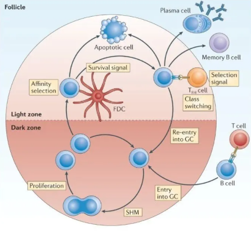 ? ? ? ?來源:藥學(xué)速覽 ▉ 導(dǎo)讀 ? ? ? ?迄今為止,我們已經(jīng)討論了先天免疫和獲得性免疫的各個(gè)組成部分以及它們的相互作用以組成完整的防御系統(tǒng)。然而,要真正理解免疫系統(tǒng)的工作,我們必須清楚地了解這些作用都發(fā)生在什么部位。免疫系統(tǒng)對(duì)攻擊者的防御實(shí)際上有三個(gè)階段:危險(xiǎn)物的識(shí)別,針對(duì)入侵者的武器的生產(chǎn),以及將這些武器運(yùn)送到攻擊地點(diǎn)。適應(yīng)性免疫反應(yīng)的識(shí)別階段發(fā)生在二級(jí)淋巴器官。在接下來幾期的講解中,我們將為大家介紹二級(jí)淋巴器官;首先在這一期推送,我們先為大家介紹所有二級(jí)淋巴器官的共有特征——淋巴濾泡。 ? ? ? ?首先讓我們先來回憶一下在之前的推送中,我們討論了B細(xì)胞和T細(xì)胞的激活要求。例如要實(shí)現(xiàn)輔助性T細(xì)胞幫助B細(xì)胞產(chǎn)生抗體的這一過程,前提是B細(xì)胞受體需以簇集的方式識(shí)別相關(guān)的信號(hào)分子,然后是Th細(xì)胞必須找到顯示其同源抗原的抗原呈遞細(xì)胞并被其激活,最后,該B細(xì)胞必須找到該對(duì)應(yīng)的激活的Th細(xì)胞。當(dāng)你了解到T細(xì)胞或B細(xì)胞的體積僅為人類平均體積的一百萬億分之一時(shí),這個(gè)“尋找過程”問題的嚴(yán)重性就變得顯而易見了——B細(xì)胞怎么可能被激活? ? ? ? ?幸運(yùn)的是,機(jī)體內(nèi)各種免疫系統(tǒng)功能參與者的動(dòng)作都經(jīng)過精心設(shè)計(jì),不僅是為了提高效率,也是為了確保將適當(dāng)?shù)奈淦鬟\(yùn)送到身體內(nèi)需要它們的位置。因此,為了真正理解這個(gè)系統(tǒng)是如何工作的,我們必須清楚地了解所有這些相互作用在身體中發(fā)生的位置。因此,現(xiàn)在是我們關(guān)注免疫系統(tǒng)“地理學(xué)”的時(shí)候了。回答剛剛提出的問題,二級(jí)淋巴器官使得抗原呈遞細(xì)胞、T細(xì)胞和B細(xì)胞在有利于激活條件下的相遇成為了可能。 ? ? ? ?免疫系統(tǒng)對(duì)攻擊者的防御實(shí)際上有三個(gè)階段:危險(xiǎn)物的識(shí)別,針對(duì)入侵者的武器的生產(chǎn),以及將這些武器運(yùn)送到攻擊地點(diǎn)。適應(yīng)性免疫反應(yīng)的識(shí)別階段發(fā)生在次級(jí)淋巴器官,包括淋巴結(jié)(lymph nodes )、脾臟(spleen)和粘膜相關(guān)淋巴組織(mucosal‐associated lymphoid tissue,簡稱MALT)。這時(shí)候你是否想問:如果這三者是次級(jí)淋巴器官,那么初級(jí)淋巴器官由哪些器官組成呢?答案是,骨髓是初級(jí)淋巴器官,B細(xì)胞和T細(xì)胞都在骨髓中誕生,T細(xì)胞在胸腺中接受“早期訓(xùn)練”。 ▉ 淋巴濾泡 ? ? ? ?所有二級(jí)淋巴器官的共同解剖特征是——它們都含有淋巴濾泡(lymphoid follicle)。這些淋巴濾泡對(duì)適應(yīng)性免疫系統(tǒng)發(fā)揮功能至關(guān)重要。淋巴濾泡的初始形態(tài)是“初級(jí)淋巴濾泡”——它嵌入在富含B細(xì)胞的二級(jí)淋巴器官中濾泡樹突狀細(xì)胞(follicular dendritic cells ,F(xiàn)DCs)的松散網(wǎng)絡(luò)區(qū)域,因此淋巴濾泡實(shí)際上是B細(xì)胞海洋中的濾泡樹突細(xì)胞“島嶼”。 ? ? ? ?雖然FDC具有典型的海星樣的突狀外形,但它們與我們之前討論的抗原呈遞樹突狀細(xì)胞(DC)非常不同。樹突狀細(xì)胞是骨髓中產(chǎn)生的白細(xì)胞,然后遷移到組織中的“前哨位“。與之相反,濾泡樹突狀細(xì)胞則是常規(guī)的老細(xì)胞(類似皮膚細(xì)胞或肝細(xì)胞),隨著胚胎的發(fā)育,它們在二級(jí)淋巴器官中選定了它們的最終位置。事實(shí)上,濾泡樹突狀細(xì)胞在妊娠中期已經(jīng)存在。濾泡樹突狀細(xì)胞和抗原呈遞樹突狀細(xì)胞不僅起源大不相同,而且這兩種海星形狀的細(xì)胞還具有非常不一樣的功能。樹突狀抗原呈遞細(xì)胞的作用是通過MHC分子將抗原呈遞給T細(xì)胞,而濾泡樹突狀細(xì)胞的功能是將抗原呈遞給B細(xì)胞。 ▉? FDC的工作原理 ? ? ? ?在感染早期,補(bǔ)體蛋白與入侵者結(jié)合后,某些補(bǔ)體調(diào)理的抗原將通過淋巴或血液輸送到二級(jí)淋巴器官。定居在二級(jí)淋巴器官中的濾泡樹突狀細(xì)胞表面含有能夠結(jié)合補(bǔ)體片段的受體,因此,濾泡樹突狀細(xì)胞能夠結(jié)合并保留補(bǔ)體調(diào)理抗原。通過這種方式,濾泡樹突狀細(xì)胞表面能“修飾”上來源于戰(zhàn)斗組織中的抗原。在戰(zhàn)斗的后期,當(dāng)抗體產(chǎn)生后,抗體調(diào)理的入侵者也可以被濾泡樹突狀細(xì)胞捕獲并呈遞——因?yàn)镕DC也具有可以與抗體分子恒定區(qū)域結(jié)合的受體。此外,通過捕獲大量抗原并將它們緊密結(jié)合在一起,F(xiàn)DC以能夠以交聯(lián)B細(xì)胞受體的方式呈遞抗原。 ? ? ? ?因此,濾泡樹突狀細(xì)胞捕獲調(diào)理過的抗原,并以一種有助于激活B細(xì)胞的構(gòu)型將這些抗原“廣告”遞給B細(xì)胞。那些受體與其同源抗原結(jié)合而被懸掛在濾泡樹突狀細(xì)胞“樹”上的B細(xì)胞會(huì)先在淋巴濾泡中停留,并在該處增殖以增加其數(shù)量。這種情況一旦發(fā)生,濾泡就開始生長并成為B細(xì)胞發(fā)育中心。這種活躍的淋巴濾泡稱為“二級(jí)淋巴濾泡”或“生發(fā)中心”。補(bǔ)體調(diào)理抗原在觸發(fā)生發(fā)中心發(fā)育中的作用無論怎樣強(qi