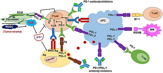 ? ? ? ?PD-1和PD-L1是受體-配體系統(tǒng),在腫瘤微環(huán)境中它們彼此連接,從而阻斷抗腫瘤免疫反應(yīng)。PD-1主要在免疫系統(tǒng)的T細(xì)胞上表達(dá),而PD-L1在癌細(xì)胞和抗原呈遞細(xì)胞上。因此,阻斷PD-1和PD-L1相互作用的抑制劑能引起T細(xì)胞介導(dǎo)的抗腫瘤免疫作用的復(fù)活,激活T細(xì)胞介導(dǎo)的免疫反應(yīng)。臨床研究表明阻斷PD-1和PD-L1的抗體對(duì)許多晚期惡性腫瘤具有可靠的效果。抑制PD-1和PD-L1相互作用的單克隆抗體(mAb)克服了常規(guī)抗癌療法的缺點(diǎn),并可增強(qiáng)部分T細(xì)胞功能,縮小實(shí)體腫瘤,抑制晚期腫瘤和轉(zhuǎn)移,進(jìn)而全面提高患者的生存率。