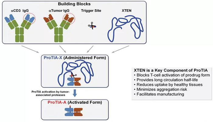 Amunix開發(fā)的一種新型雙特異性T細胞接合器通過使用XTEN技術(shù),可以將雙特異性抗體以較低劑量遞送到患者體內(nèi),從而降低毒副作用。T細胞接合器就像一個銜接蛋白,它能夠像一座橋一樣將腫瘤和T細胞拉到一起。XTEN是一種蛋白多聚物,它能夠像聚乙二醇(PEG)與雙特異性抗體連接在一起,在不需要Fc蛋白域的情況下,提高它們在體內(nèi)的半衰期。