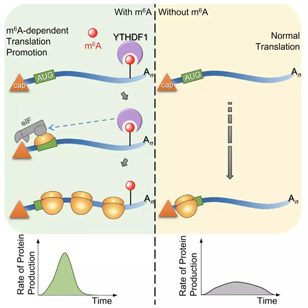 不過,早在2015年,何川團隊就發(fā)現(xiàn)m6A修飾后的mRNA通過與YTHDF1結合影響基因的翻譯效率[13]。