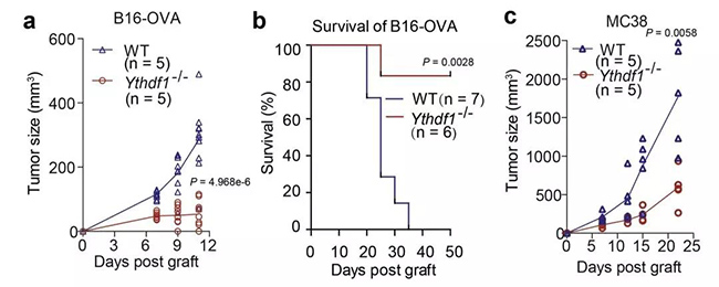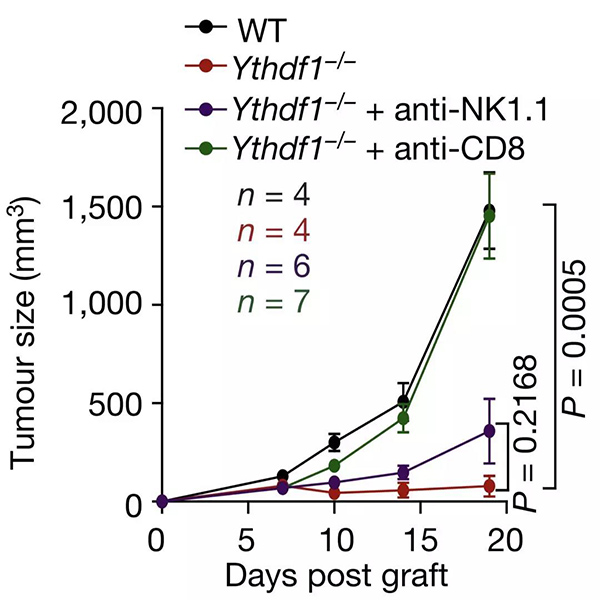 研究人員將黑色素瘤和腸癌細胞分別接種到YTHDF1基因敲除和野生型小鼠身上。在兩種癌癥模型小鼠身上,研究人員都觀察到了YTHDF1基因敲除小鼠腫瘤的大小遠小于野生型,而且YTHDF1缺陷型小鼠身上腫瘤抗原特異性CD8陽性T細胞和NK細胞的反應也更猛烈。