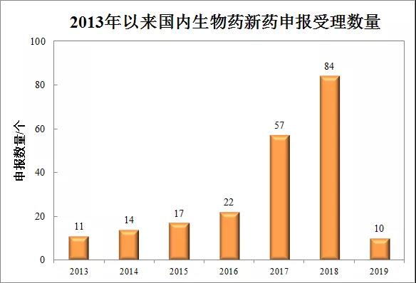 2010年以來(lái),國(guó)內(nèi)生物藥新藥研發(fā)投入走入快車道,傳統(tǒng)藥企紛紛布局生物藥,以抗體藥物為主的海歸創(chuàng)業(yè)潮,火熱的資本市場(chǎng),使得國(guó)內(nèi)生物醫(yī)藥產(chǎn)業(yè)得到空前的發(fā)展。經(jīng)過(guò)幾年的布局,2國(guó)內(nèi)生物藥新藥申報(bào)受理的數(shù)量開(kāi)始噴發(fā),從之前每年十幾個(gè)迅速攀升到2016年的22個(gè)、2017年的57個(gè)和2018年的84個(gè)。從2013年來(lái)截止到發(fā)稿日,藥審中心累計(jì)受理215件生物藥新藥的臨床申請(qǐng)。