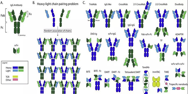 單抗的兩個結(jié)合區(qū)域針對同一表位。因此,單抗是雙價且具有靶標單一性。相反,bsAbs具有能結(jié)合兩個不同的靶標的表位,根據(jù)其結(jié)構(gòu)的不同,可以是單價的,也可以是雙價的。 單抗通常由雜交瘤細胞系表達,雜交瘤細胞系是分泌抗體的B細胞和永生的骨髓瘤細胞系的融合體。BsAbs可以通過融合兩個雜交瘤細胞系而產(chǎn)生,其結(jié)果是產(chǎn)生IgG分子的混合物。此外雙抗還可以通過組合兩種現(xiàn)有抗體或它們的片段來產(chǎn)生。另一種因其靈活性而廣受歡迎的選擇是使用重組蛋白。使用遺傳工程化重組蛋白質(zhì)創(chuàng)造了關(guān)于起源組成和生產(chǎn)系統(tǒng)。例如,這些蛋白質(zhì)可以用來控制重鏈和輕鏈的結(jié)合?;镜腷sAb結(jié)構(gòu)包括來自一種抗體的重輕鏈對和來自另一種抗體的重輕鏈對。當(dāng)這四個單獨的鏈結(jié)合在一起時,它們隨機結(jié)合,可以產(chǎn)生16種IgG分子的組合。其中的兩種組合產(chǎn)生了所需的bsAbs結(jié)構(gòu),其異質(zhì)二聚重鏈與來自同一抗體的特定輕鏈結(jié)合(圖1B)。嵌合四聚體、常見的輕鏈和重組蛋白可以通過限制締合的選擇來提供解決方案。嵌合四聚體具有受物種限制的重-輕鏈配對。此外,使用普通的輕鏈也可以防止不必要的重輕鏈組合。重組蛋白可以通過多種途徑促進重輕鏈與重鏈的正確結(jié)合。 例如,孔內(nèi)旋鈕方法,其中一個重鏈是由一個由相對較大的氨基酸組成的旋鈕設(shè)計的,而另一個重鏈是由一個由相對較小的氨基酸組成的孔設(shè)計的。其他的例子是由肽鏈連接片段的結(jié)構(gòu),例如雙特異性T細胞銜接器(BiTE)分子,從而繞過鏈的隨機關(guān)聯(lián)。?