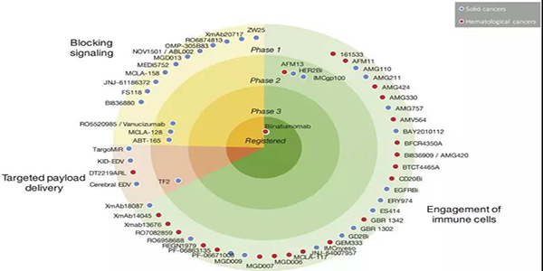 ??圖3.正在開發(fā)中并在ClinicalTrials.gov網(wǎng)站上注冊了癌癥患者的臨床試驗的BsAbs。BsAbs顯示為點,它們在圖表中的位置表示開發(fā)的階段及其作用機制。注冊的bsAbs都顯示在圖表的中心,處于臨床1期的bsAbs顯示在外圍。bsAbs也按照作用機制進行分類:綠色部分表示有免疫細胞的參與的雙抗,紅色部分表示靶向bsAbs,黃色部分表示具有信號阻斷的雙抗。點的顏色表示bsAb是針對實體瘤還是血液瘤。