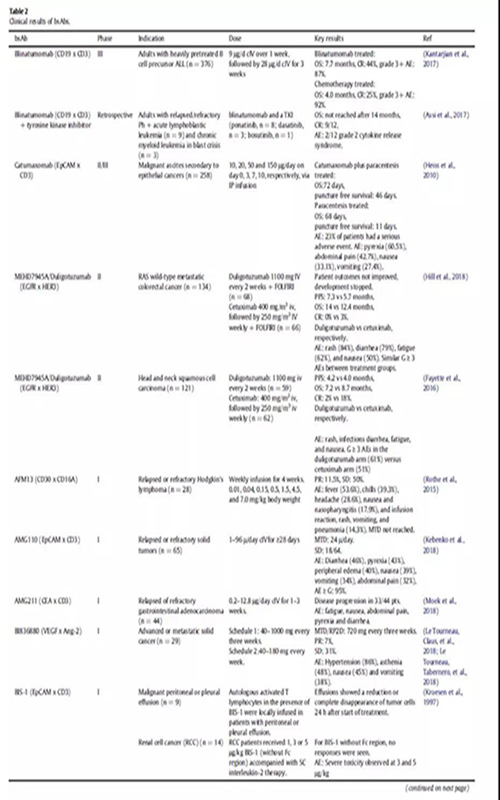 由于不同信號之間相互作用,普通bsAbs主要干擾兩個信號途徑,如ErbB家族成員EGFR、HER2和HER3。 BsAbs MM-111、JNJ-61186372和MEHD7945A是針對這些目標中的一個或多個。盡管它們的半衰期都很長(表1),但是它們使用不同的結(jié)構(gòu)來實現(xiàn)這一點。 有趣的是,針對EGFR和HER3的bsAb MEHD7945A比抗EGFR抗體西妥昔單抗或EGFR 激酶抑制劑厄洛替尼更有效,在人非小細胞肺癌和頭頸部鱗癌的異種移植模型中克服了西妥昔單抗和厄洛替尼耐藥。這很可能是由于阻斷了ErbB家族成員的信號通路的交互作用。然而,MEHD7945A對轉(zhuǎn)移性結(jié)直腸癌和頭頸部鱗狀細胞的2期試驗中沒有發(fā)現(xiàn)MEHD7945A優(yōu)于西妥昔單抗的益處。因此,這個bsAb的開發(fā)已經(jīng)停止(表2)。 正在研究的其他靶標有死亡受體,如CD95,或參與溶酶體內(nèi)化的受體,如CD63。以CD20和cd95為靶點的bsAb比不同的抗CD20抗體變體更能抑制人類異種移植瘤小鼠的腫瘤生長。為了提高抗體藥物偶聯(lián)物,我們設(shè)計了一種載藥bsAb,它除了結(jié)合HER2外,還結(jié)合受體CD63。熒光共聚焦顯微鏡顯示,能夠誘導(dǎo)其內(nèi)化,改善了her2陽性異種移植小鼠模型的腫瘤抑制作用。 CD47-SIRPα交互,也稱之為“別吃我信號”,通過在巨噬細胞上表達的SIRPα抑制表達CD47的細胞的吞噬作用和該靶點過表達在許多固體和血液腫瘤細胞上。這種相互作用也可能被bsAbs破壞。在與Raji腫瘤細胞異種移植的小鼠中,靶向CD20和CD47的IgG-scFv bsAb延長了小鼠的生存期,靶向CD19和CD47的IgG-like bsAb根除了腫瘤,而抗cd47、抗cd20或抗cd19抗體是無效的。 靶向SIRPα在用Burkitt淋巴瘤異種移植的小鼠中不誘導(dǎo)腫瘤消退,盡管結(jié)合anti-CD20抗體美羅華導(dǎo)致協(xié)同效應(yīng)和作用于SIRPα和CD70的bsAb減緩腫瘤的生長。然而,bsAb與抗SIRPα抗體聯(lián)合抗CD70抗體產(chǎn)生的腫瘤生長減少相同。 ?
