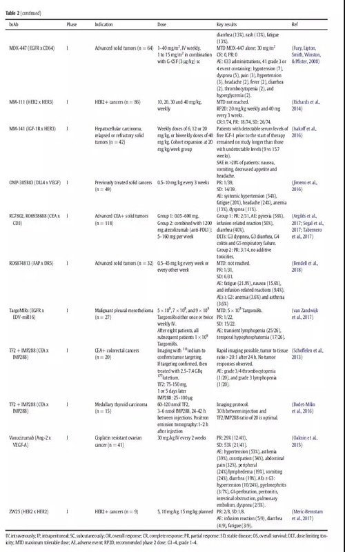 bsAbs通過結(jié)合螯合劑半抗原,在動物模型中探索了bsAb(如阿霉素)預(yù)先靶向遞送其他有毒有效載荷。在這些研究中,螯合劑被加載放射性同位素锝-99,以驗證目標特異性結(jié)合。其他半抗原,如地高辛,也可以結(jié)合到有效載荷上,用于藥物傳遞。幾種有效載荷,如阿霉素和與地高辛結(jié)合的熒光染料Cy5,在人類異種移植小鼠模型中顯示出特定的靶向性。 一種直接靶向的方法,即在給藥前將bsAb和有效載荷孵育的方法正在進行臨床實驗。在這種方法中,有效載荷被封裝在一個細菌衍生的納米細胞中,稱為engeneic delivery vehicle (EDV),bsAbs是通過Fc區(qū)域連接在一起的兩個抗體。有效載荷可以是化療藥物,如阿霉素或紫杉醇,但也可以是microRNA。三個測試EDVs的試驗結(jié)果已經(jīng)公開,一期臨床數(shù)據(jù)顯示安全狀況尚可接受。 bsAb DT2219與有效載荷直接偶聯(lián),并且靶向CD22和CD19以增強特定的遞送能力。有效載荷為白喉毒素,經(jīng)CD19和/或CD22內(nèi)化后進入胞質(zhì)。該bsAb已在難治性B細胞惡性腫瘤患者中進行研究,25例患者中有1例出現(xiàn)完全反應(yīng)和1例出現(xiàn)部分反應(yīng)(表2)。