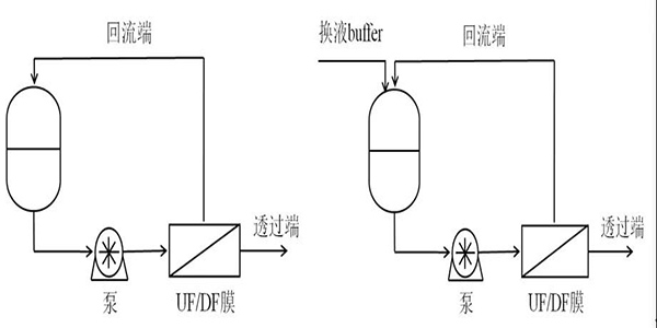 UF基于膜孔徑或分子量截留分離溶液中的分子如圖2-2。DF常用于在恒定體積下改變回流溶液的化學(xué)性質(zhì)如圖2-3。?不需要的顆粒通過膜同時通過添加置換緩沖液將原料液的組成改變?yōu)楦硐氲臓顟B(tài)。在生物技術(shù)中滲濾通常用于將產(chǎn)物交換到最終制劑緩沖液中[22]。UF和DF常使用切向流過濾[23]其中料液平行流過膜表面而過濾的同時也對濾膜進(jìn)行了沖刷使膜表面不會形成凝膠層從而使料液中的顆粒不會很快堵塞濾膜。該步驟目的是確保單克隆抗體制劑和濃度達(dá)到藥物規(guī)格。