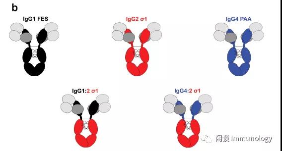 設(shè)計兩個IgG亞型,將IgG1和IgG4的F(ab)2包含鉸鏈區(qū)融合到IgG2 σ1-Fc (命名為 IgG1:2 σ1 and IgG4:2 σ1)。