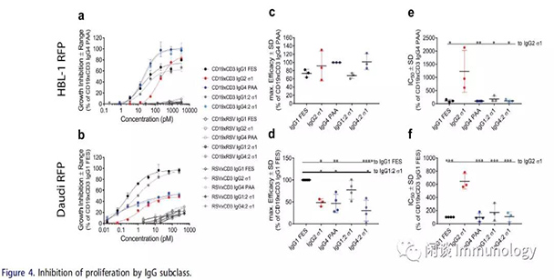 Janssen BioTherapeutics的科學(xué)家,通過controlled Fab-arm exchange (cFAE)技術(shù),建立IgG1,IgG2,IgG4三種亞型的CD3XCD19雙特異性抗體。結(jié)合CD19膜遠(yuǎn)端結(jié)構(gòu)域的親本抗體是以人源化的blinatumomab(博納吐單抗)為基礎(chǔ)的,結(jié)合CD3e鏈的親本抗體是基于OKT3的可變區(qū)。為了盡可能減少Fcγ受體(FcγR)的影響,采用Fc突變,減少其與FcγR的結(jié)合:IgG1 FES, IgG2 σ1and IgG4 PAA。