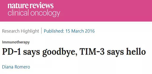 ? 2016年3月,在免疫治療靶點PD-1發(fā)展“如日中天”之時,Nature Reviews Clinical Oncology發(fā)表了一篇題為“PD-1 says goodbye, TIM-3 says hello”的文章,讓業(yè)界更多研究者關(guān)注到了TIM-3這一靶點。