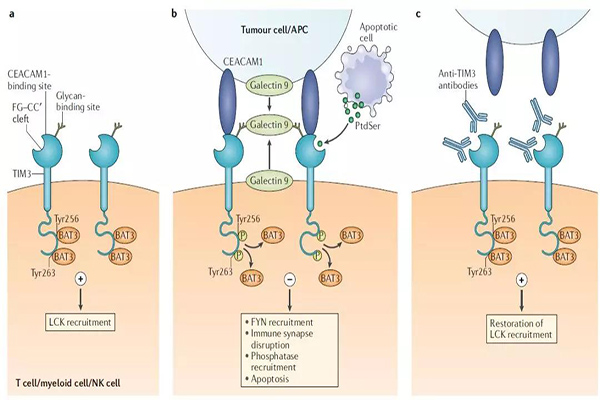 ?第一個被發(fā)現(xiàn)與TIM3有關(guān)的配體是galectin9,它是一種由許多造血細(xì)胞廣泛表達和分泌的C型凝集素,可與細(xì)胞表面蛋白上的碳水化合物部分結(jié)合。在TIM3上,galectin 9結(jié)合其IgV域上的碳水化合物基序,可誘導(dǎo)TIM3陽性T細(xì)胞(TIM3+T cells)鈣內(nèi)流和細(xì)胞死亡(圖1b)。已有大量證明表明,TIM3–galectin9相互作用在抑制免疫反應(yīng)中發(fā)揮了作用。