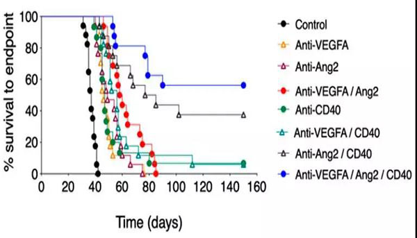 隨后,研究人員在幾種不同類型的癌癥(結(jié)直腸癌、乳腺癌和黑色素瘤)小鼠模型中測(cè)試了這種新的抗體組合。正如預(yù)期的那樣,這3種抗體的組合(抗VEGFA/Ang2/CD40抗體)能顯著提高所有癌癥小鼠模型的抗腫瘤活性并延長(zhǎng)生存期。