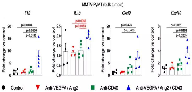 此外,研究還表明,基于抗CD40的抗血管生成免疫治療組合能促進(jìn)免疫刺激性和促炎性腫瘤微環(huán)境的生成。表現(xiàn)為小鼠乳腺腫瘤模型(MMTV-PyMT)中,3種抗體組合治療組的炎癥細(xì)胞因子(IL-1β、IL12、IL6、IFNg)和T細(xì)胞招募趨化因子(CXCL9、CXCL10)的增長(zhǎng)倍數(shù)最高。
