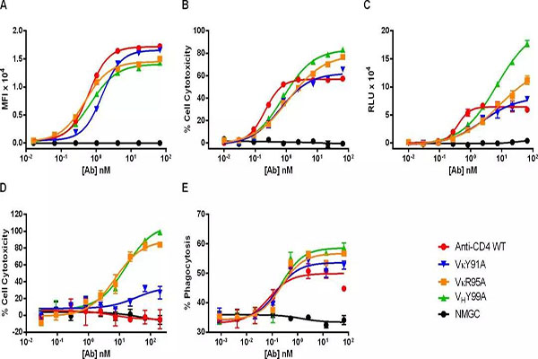 下圖A表示CD4抗體Ibalizumab及其突變體與CD47+ T細胞的結(jié)合,B、C分別為KC1333 NK細胞、NK92/NFAT細胞測定的ADCC活性,D、E分別為CDC活性和ADCP活性。突變體低親和力的抗體ADCC活性明顯增強,CDC活性、ADCP活性也有類似反向相關(guān)性。EGFR抗體、HER2抗體有類似效應(yīng)。