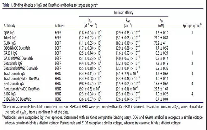 ? 為了驗證這一設(shè)想,MedImmune的科學(xué)家通過雙抗技術(shù)DuetMab構(gòu)建單價的高親和力抗體。即一側(cè)Fab保留原高親和力抗體,另一側(cè)則改為不結(jié)合抗原的NMGC,也就是雙抗中一個是無效抗體。這樣構(gòu)建的抗體就是單價結(jié)合抗原的高親和力抗體。