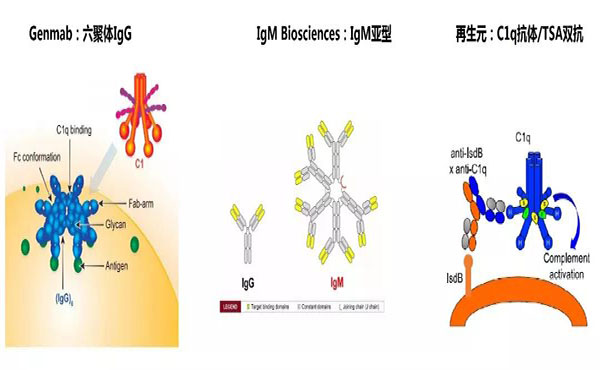 在此之前,對于ADCC的改造多在于Fc的序列突變或者糖基化改造(巖藻糖敲除),對于CDC的改造如Genmab六聚體IgG和IgM Bioscience的IgM亞型、再生元的C1q抗體/TSA雙抗,這些工程化改造都停留在Fc層面。 ? ??
