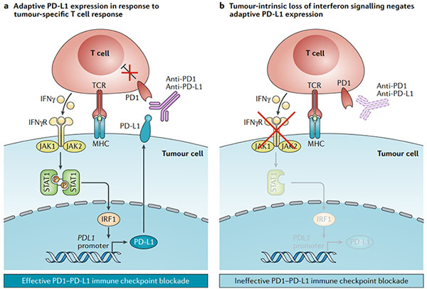 ? ? ?? 預(yù)先存在的抗腫瘤免疫反應(yīng)是有效的免疫檢查點阻斷的關(guān)鍵。在MHC I類或II類背景下識別腫瘤新抗原的腫瘤反應(yīng)性T細胞釋放干擾素γ(IFNγ),從而導(dǎo)致Janus激酶(JAK)信號轉(zhuǎn)導(dǎo)子和轉(zhuǎn)錄激活子(STAT)信號通路的激活。這激活了轉(zhuǎn)錄因子干擾素調(diào)節(jié)因子1(IRF1),然后激活了PDL1的轉(zhuǎn)錄。這導(dǎo)致腫瘤細胞表面上程序性細胞死亡1配體1(PD-L1)的適應(yīng)性表達,從而負調(diào)節(jié)抗腫瘤T細胞反應(yīng)。針對PD1或PD-L1的抗體破壞了這種負反饋回路,以恢復(fù)抗腫瘤免疫力。b.類似的情況是,在MHC的情況下,腫瘤特異性T細胞遇到抗原,導(dǎo)致IFNγ釋放。然而,由于IFNγ信號傳導(dǎo)途徑中的遺傳缺陷(例如影響JAK1或JAK2),因此腫瘤細胞不會傳遞IFNγ信號,并且不會發(fā)生適應(yīng)性PD-L1表達。在缺乏適應(yīng)性PD-L1表達的情況下,PD1 PD-L1免疫檢查點阻斷無效。IFNγR,IFNγ受體;TCR,T細胞受體。