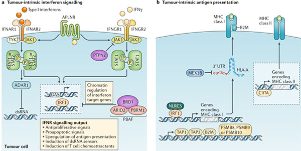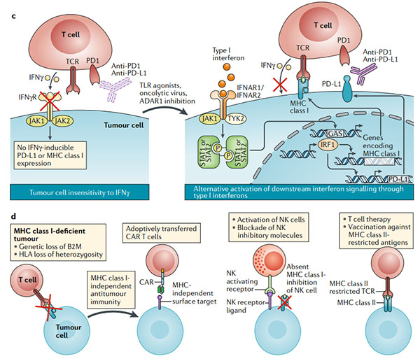 ? ? ?? c.沒有干擾素-γ(IFNγ)信號傳導(dǎo)的腫瘤缺乏響應(yīng)IFNγ自適應(yīng)表達PD-L1的能力。在一些MHC I類抗原呈遞主要依賴于IFNγ信號傳導(dǎo)的腫瘤中,IFNγ信號傳導(dǎo)的喪失等同于抗原呈遞的喪失。通過TLR激動劑,溶瘤病毒或其他方式激活其他干擾素途徑(I型干擾素)也可能導(dǎo)致信號轉(zhuǎn)導(dǎo)子和轉(zhuǎn)錄激活因子1(STAT1)和STAT2信號激活,從而激活PD-L1和MHC的轉(zhuǎn)錄通過干擾素調(diào)節(jié)因子1(IRF1)的誘導(dǎo)達到I類。