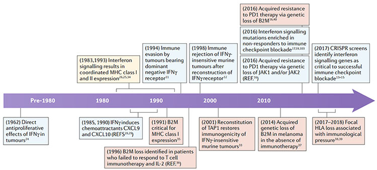 圖2.干擾素-γ(IFNγ)途徑和抗原呈遞在抗腫瘤免疫中的重要發(fā)現(xiàn)時間表