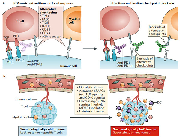 ? ? ?? b.免疫學(xué)上較冷的腫瘤類型缺乏預(yù)先存在的抗腫瘤T細胞反應(yīng),使免疫檢查點阻斷無效。通過引起免疫原性細胞死亡(溶瘤病毒或細胞毒性療法),引發(fā)抗原呈遞細胞(APC;使用Toll樣受體(TLR)激動劑和CD40激動劑)或增加腫瘤細胞對雙鏈RNA敏感性來引發(fā)針對腫瘤的免疫系統(tǒng)的方法(dsRNA;例如對dsRNA特異性腺苷脫氨酶(ADAR1)的抑制作用)可以將免疫寒冷狀態(tài)重新編程為檢查點阻斷反應(yīng)狀態(tài)。